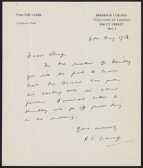 John Hindley's application to Birkbeck College