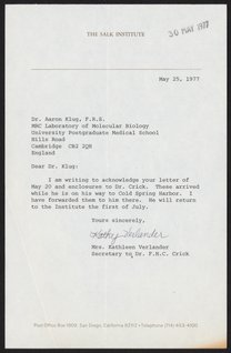 Letter from Francis Crick to Aaron Klug, September 1, 1977