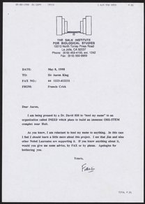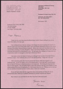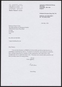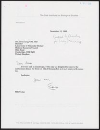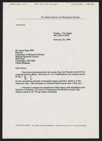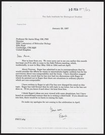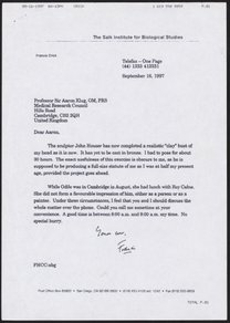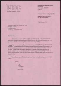 Letter from Francis Crick to Aaron Klug, February 3, 1997