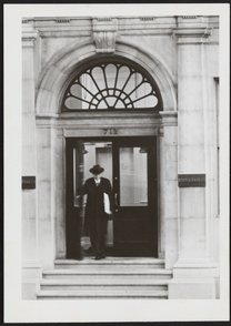 Black and white photograph of Otto Haas (1872-1960), co-founder of Rohm and Haas, leaving the office, located in Washington Square, Philadelphia, Pennsylvania.