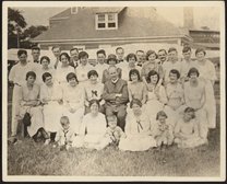 Black and white group photograph featuring Otto Haas (1872-1960) with workers and their families at the Rohm and Haas plant in Bristol, Pennsylvania.