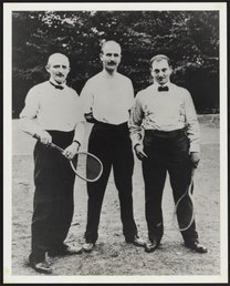 Black and white photograph of Mr. Poppe, Otto Haas (1872-1960), and Mr. Kaullain in front of a tennis court with rackets.