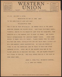 Telegram from James H. Doolittle to the employees of Rohm & Haas, May 21, 1942