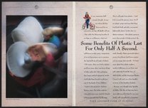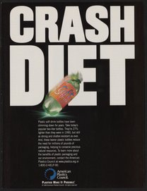 Advertisement by the American Plastics Council, featuring a plastic soft drink bottle hitting a surface. The ad boasts how plastic liter bottles are slimmer, lighter, and shatter-resistant, thus being a superior form of…