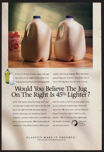 Advertisement by the American Plastics Council, featuring two gallons of milk. The ad boasts that plastic packaging is lightweight, shatter-resistant, and comes with a tamper-evident seal.
