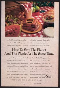 Advertisement by the American Plastics Council, featuring food on a picnic blanket in plastic packaging and food storage. The text praises how plastic keeps food fresh and is environmentally friendly.
