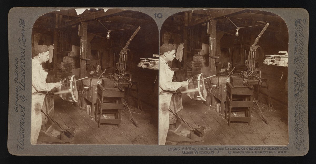 “Adding Molten Glass to Neck of Carboy to Make Rim.” Underwood & Underwood, n.d. Underwood & Underwood Stereographs of Manufacturing Industries. Science History Institute. Philadelphia. https://digital.sciencehistory.org/works/000000018.