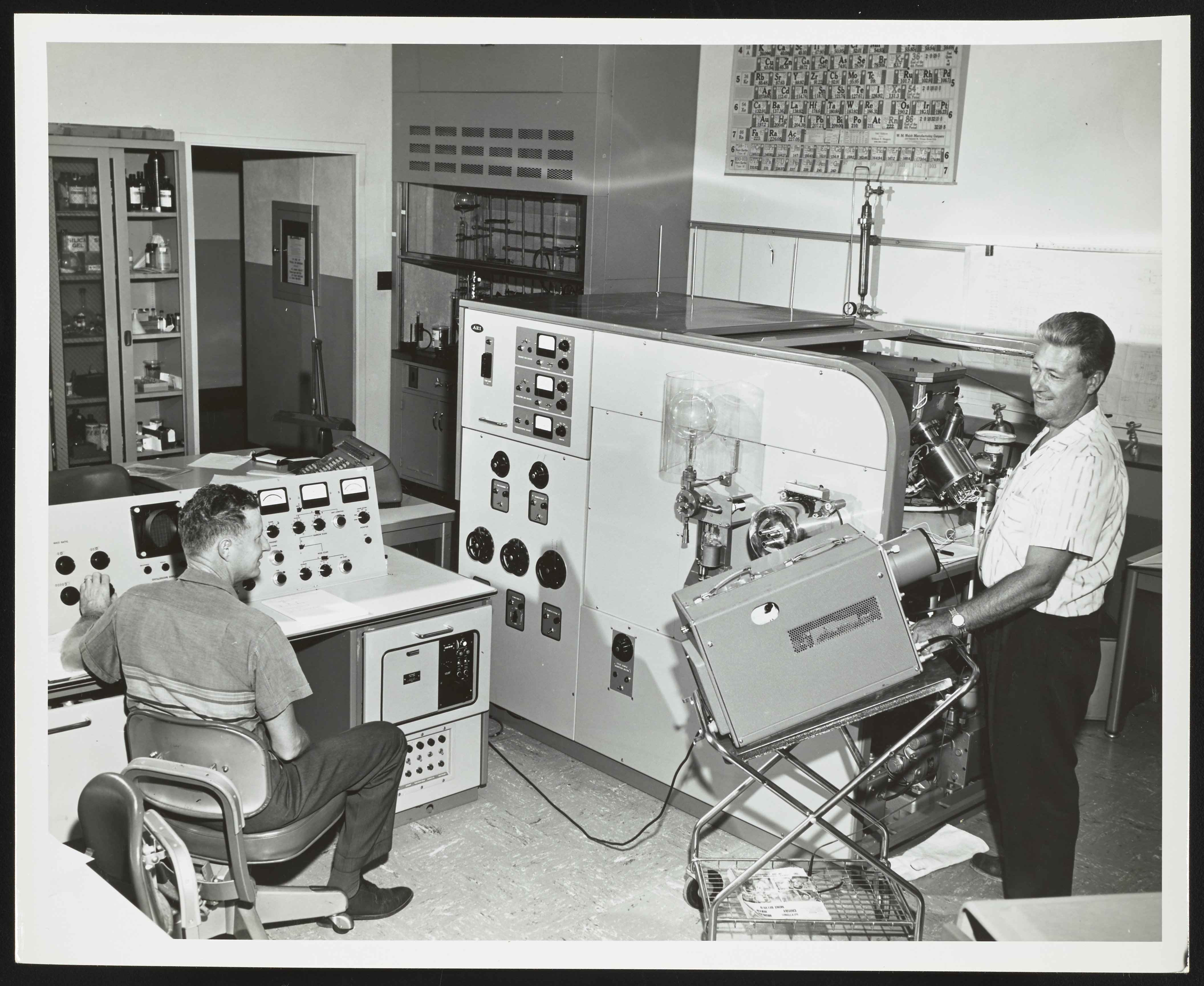Mass Spectrometer 9 (MS-9) in use at the Humble Oil and Refining Company Research and Development Division laboratory located in Baytown, Texas. At left, Henry Earle Lumpkin (Mass Spectrometrist) is seated at the operating console while Electronics Technician "Jug" Daniels stands to the right.
