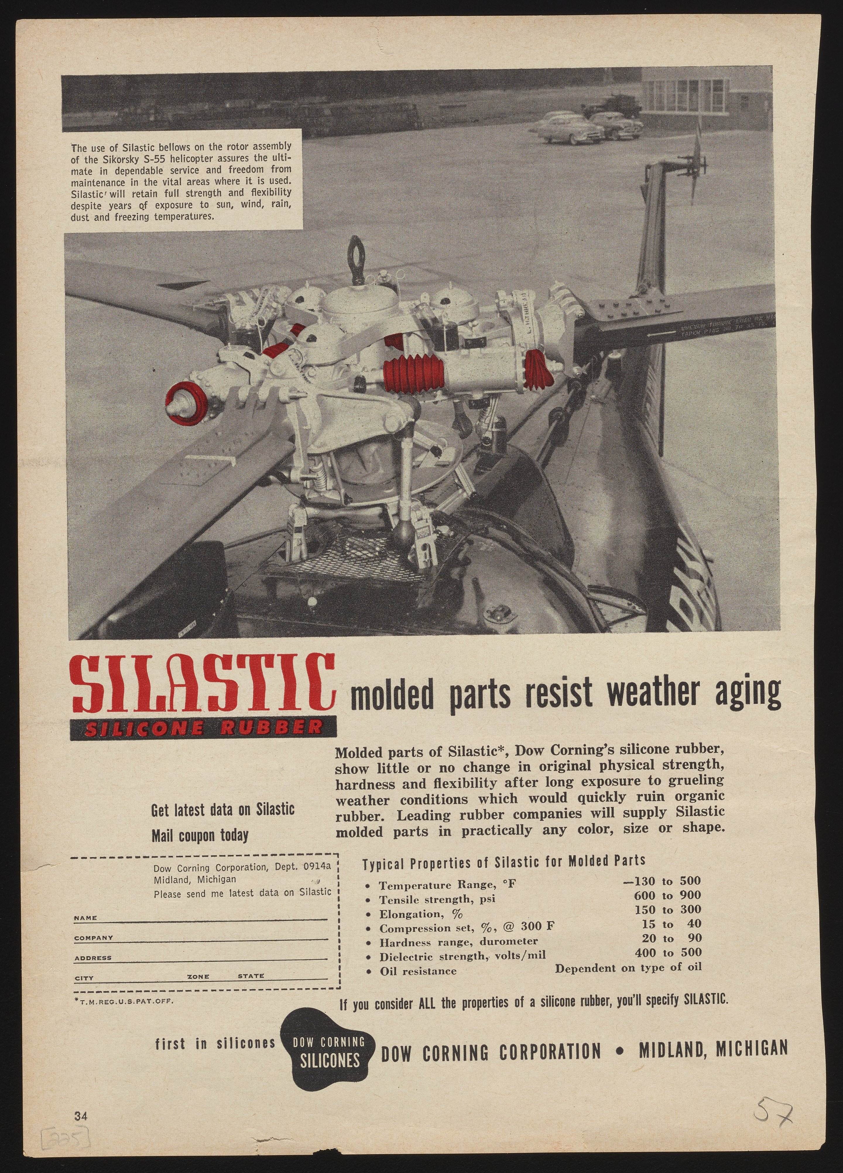 Print advertisement for Silastic brand silicone rubber manufactured and sold by the Dow Corning Corporation. The advertisement features a close-up view of the rotor assembly of a Sikorsky S-55 helicopter, with Silastic bellows highlighted in red. The accompanying text details Silastic's durability, strength, and flexibility, even after prolonged exposure to sun, wind, rain, and freezing temperatures.