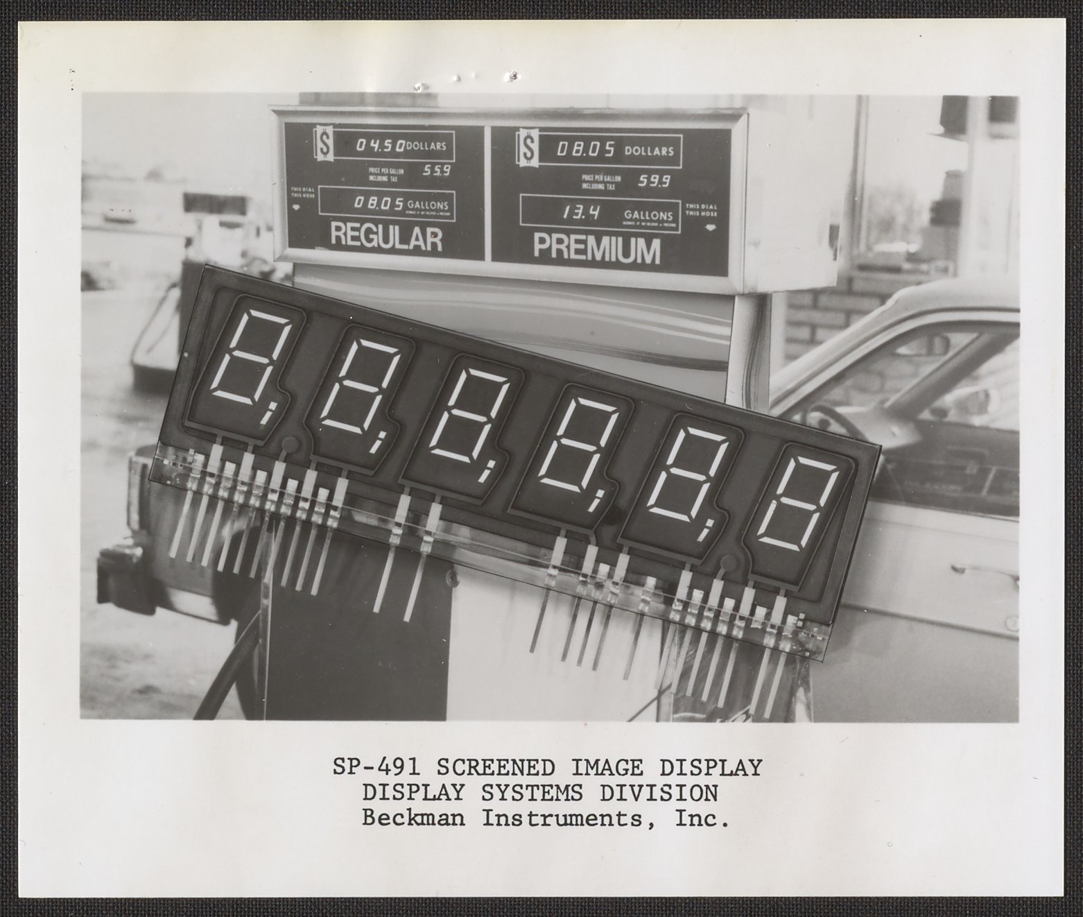 An image of the display is superimposed over a photograph of a gasoline pump.