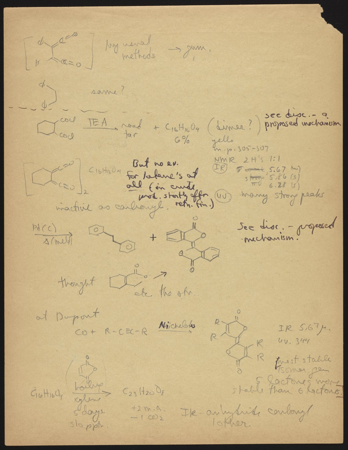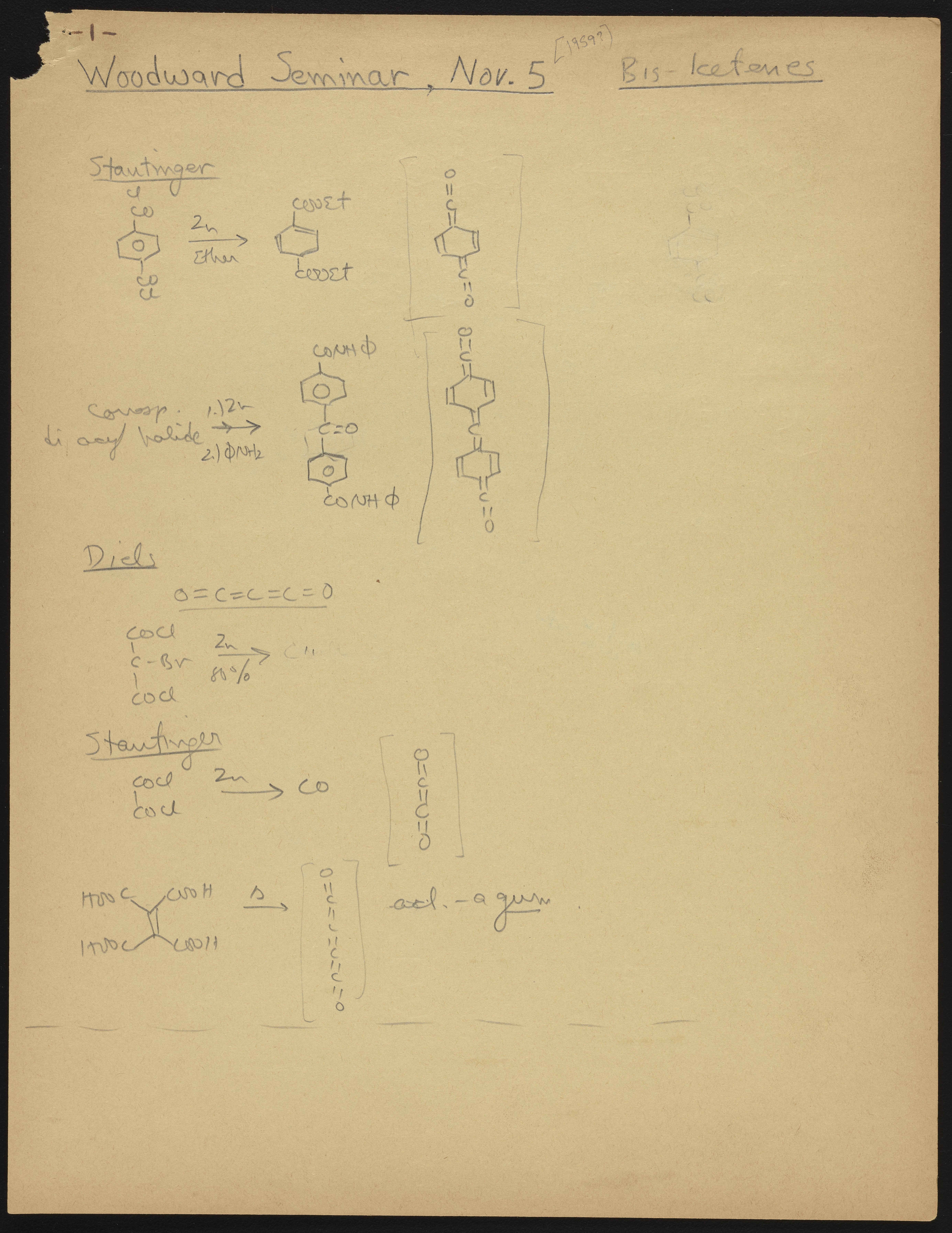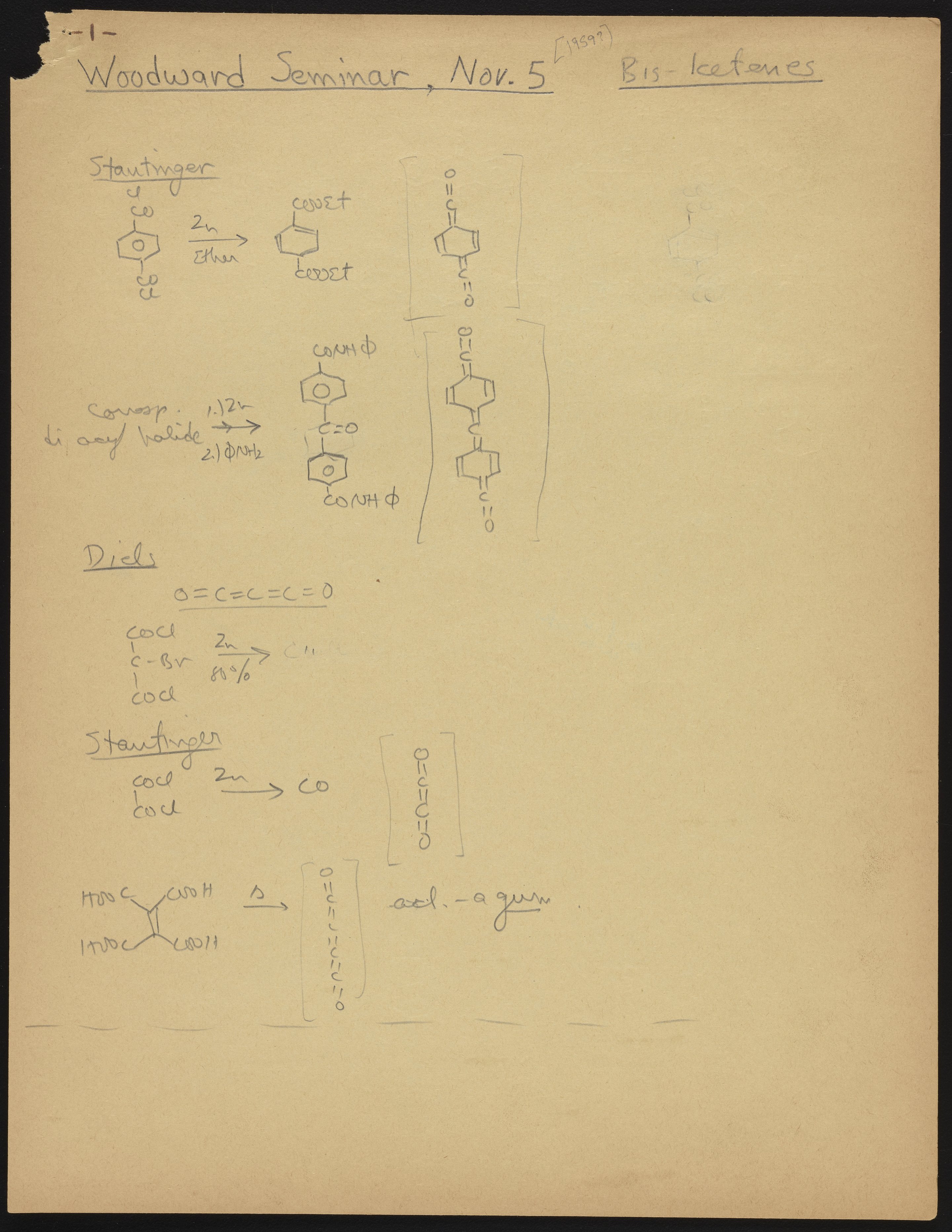 Kohler, Robert E. “R. B. (Robert Burns) Woodward Seminar Entitled ‘Bis-Ketenes.’” Notes from R. B. (Robert Burns) Woodward's Seminars, circa 1959–1966. Folder 2. Science History Institute. Philadelphia. https://digital.sciencehistory.org/works/05741s75m.