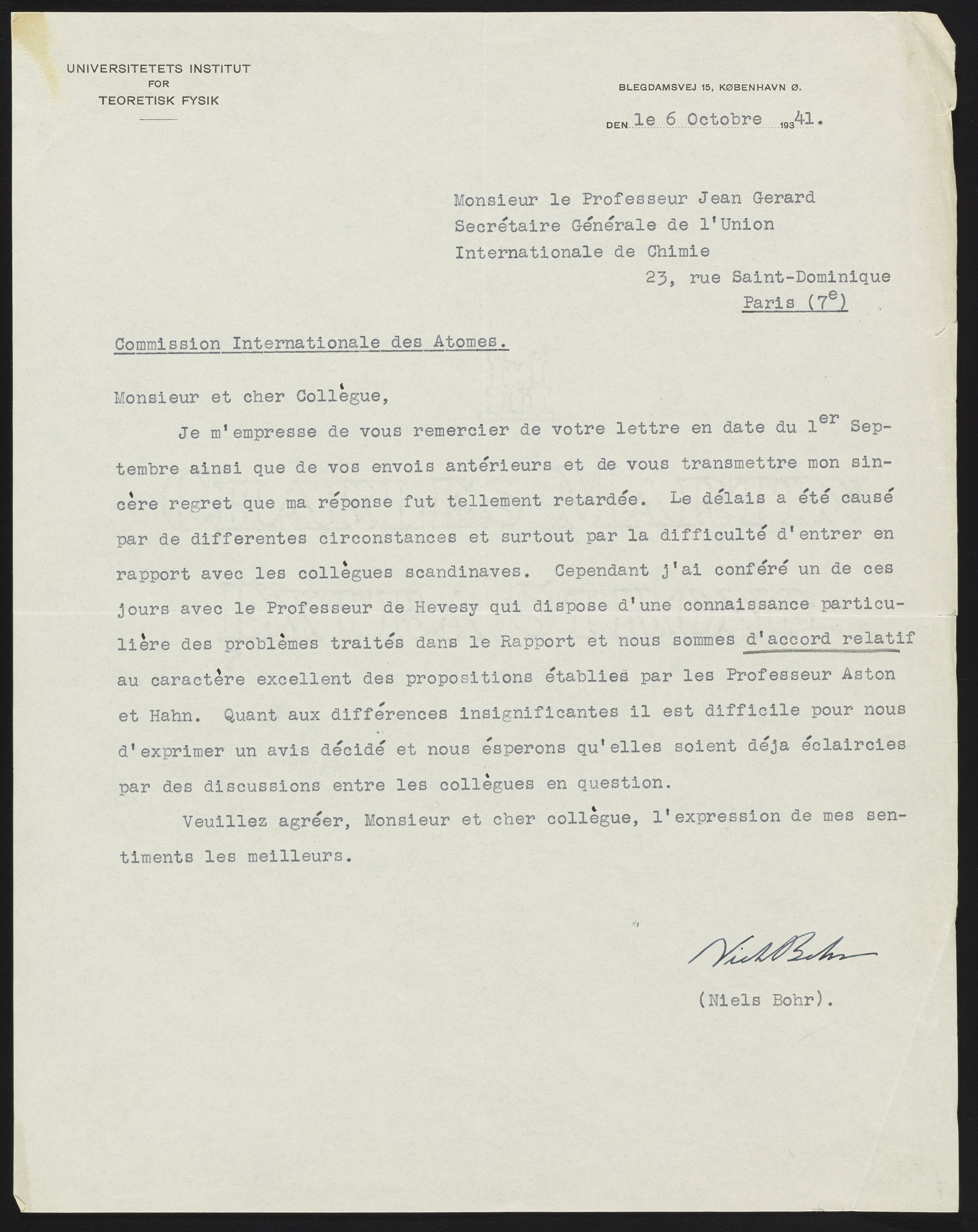 Bohr, Niels. “Letter from Niels Bohr to Jean Gerard,” October 6, 1941. Records of the Commission on Atomic Weights and Isotopic Abundances of IUPAC, Box 13, Folder 23. Science History Institute. Philadelphia. https://digital.sciencehistory.org/works/08612n57q.
