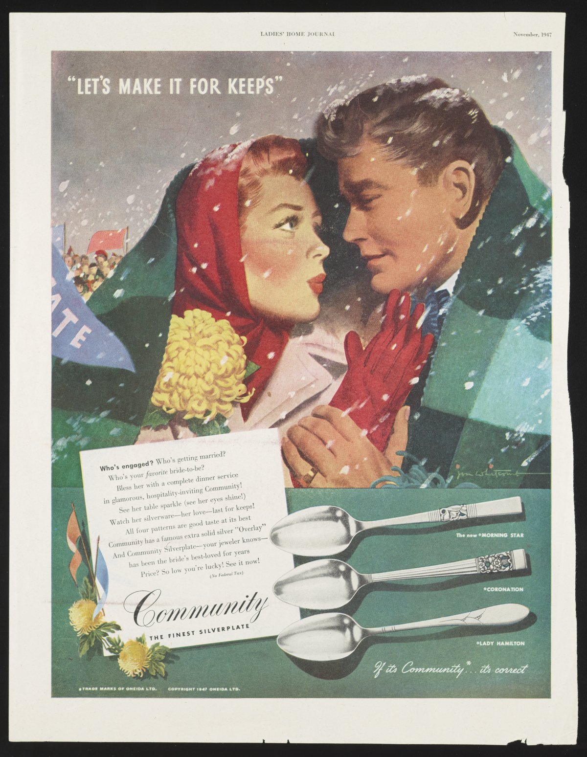 Color print magazine advertisement for Community silverware. This ad appeared in the Ladies' Home Journal, November 1947.