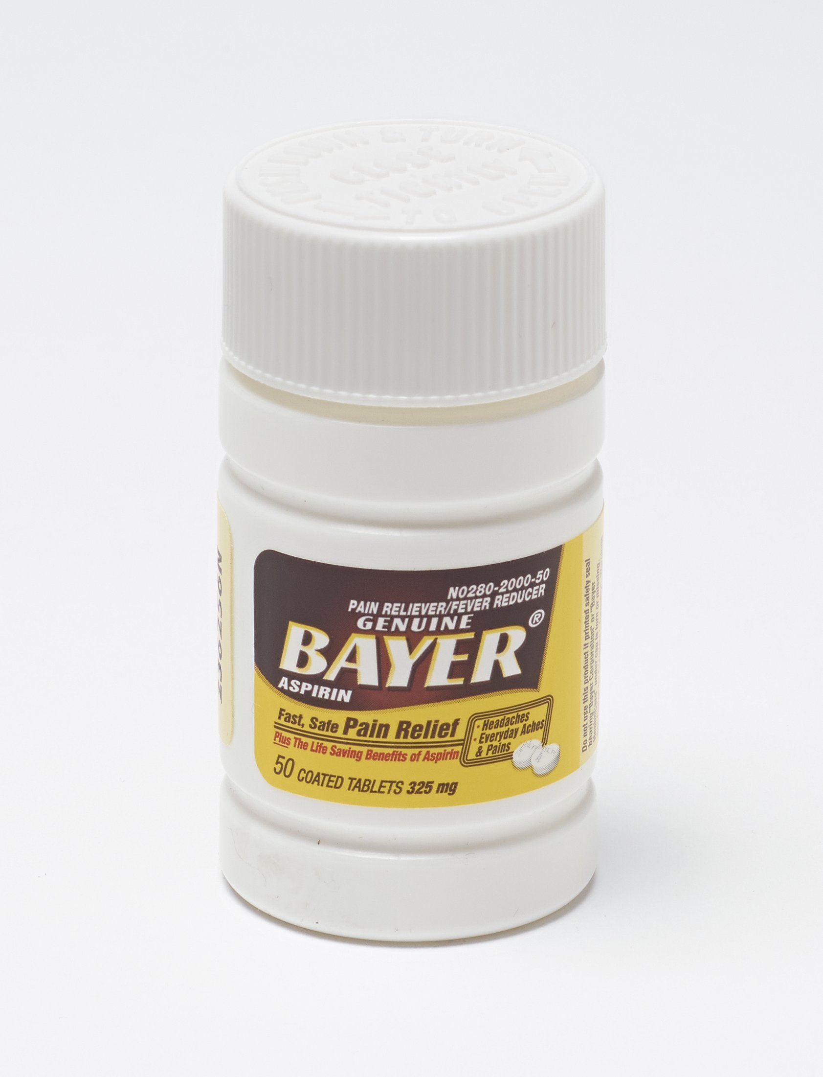 Plastic Bayer aspirin bottle, 50 tablet size, contains tablets.