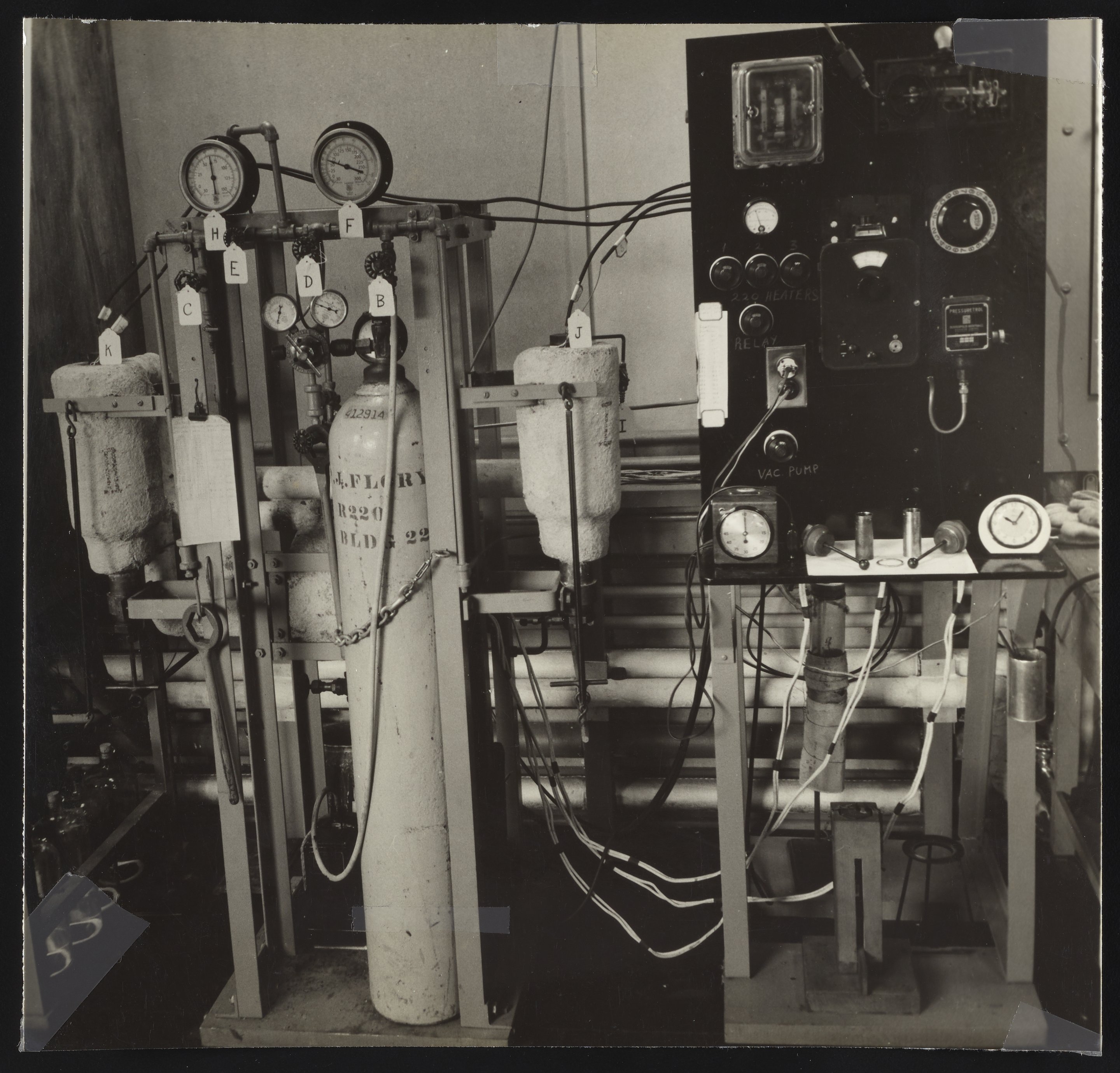 General view of a melt viscometer used during the early stages of nylon production and research at the DuPont Experimental Station in Wilmington, Delaware. This machine was used to measure the melt viscosity and molecular weights of experimental polymers as a means of evaluating the consistency of these materials. Notably, the name of Dr. Paul Flory, winner of the 1974 Nobel Prize for Chemistry, is imprinted on the nitrogen cylinder visible on the left-hand side of the photograph, indicating that the nitrogen met his standards for purity. To protect hot nylon polymers from oxidation, DuPont notably used a purified grade of nitrogen that became known as "Seaford-grade nitrogen" after the company's nylon plant located in Seaford, Delaware.