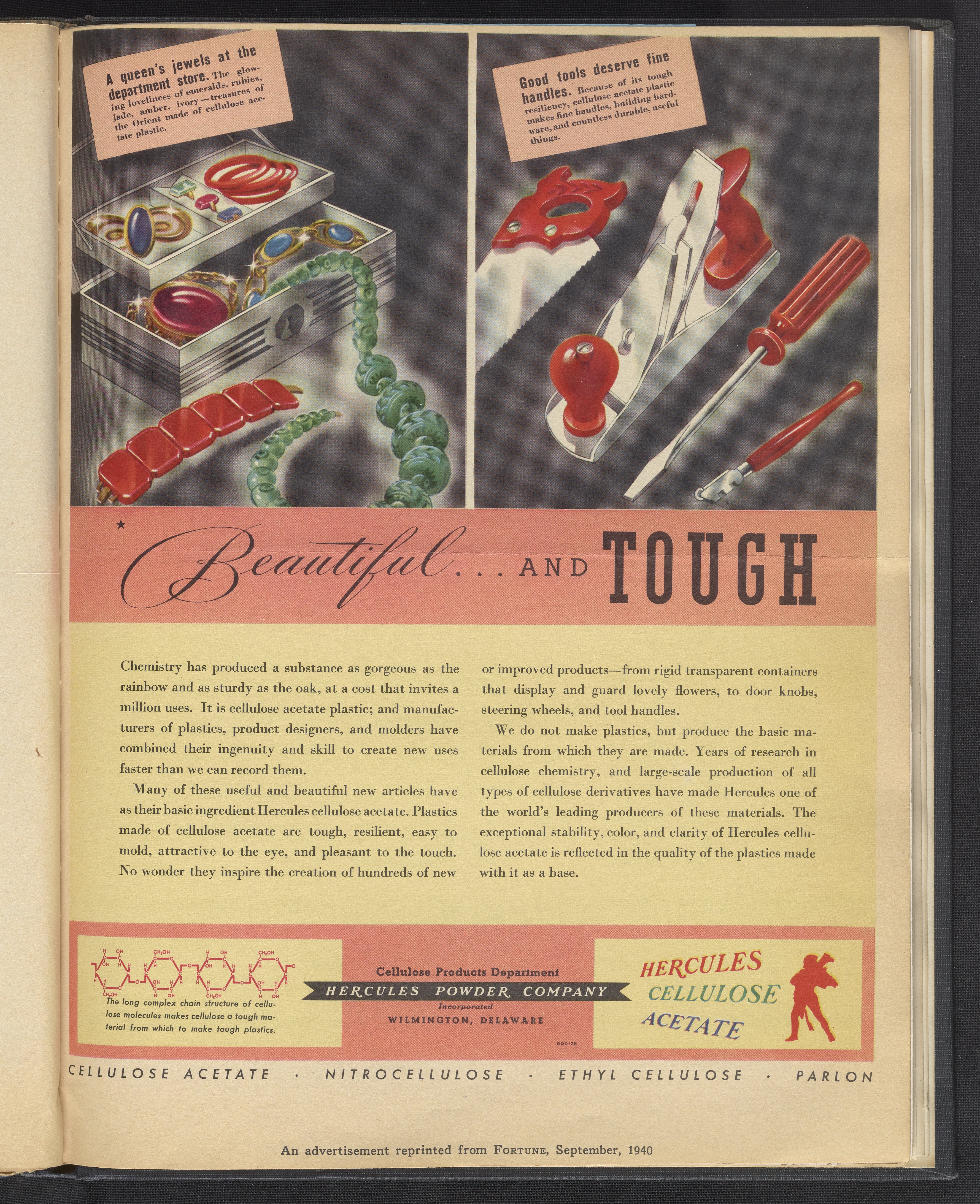 Hercules Incorporated. “Beautiful...and Tough.” 1940 Hercules Advertisements, 1940. Records of Hercules Incorporated, Volume 1940. Science History Institute. Philadelphia. https://digital.sciencehistory.org/works/0g354g04n.