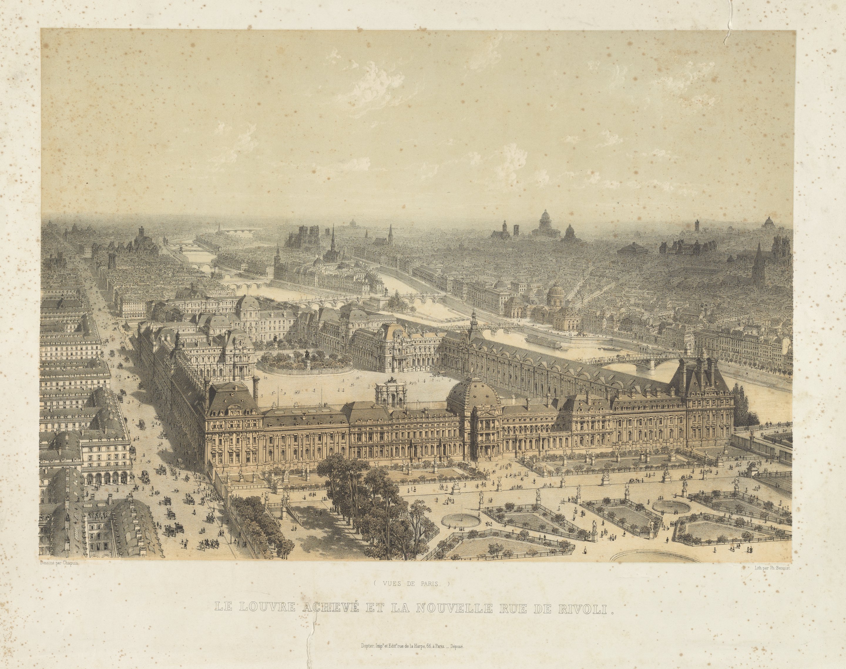 "Le Louvre Achevé et la Nouvelle Rue de Rivoli," which translates to "The completed Louvre and New Rue de Rivoli," depicts an aerial view of Paris, seen from a hot air balloon. Philippe Benoist (French, Geneva 1813–ca. 1905) was a popular lithographer and executed several series of landscape views of France and Switzerland. This print probably dates to the 1850s or 1860s, during the reconstruction of Paris organized by Georges-Eugène Haussmann.
