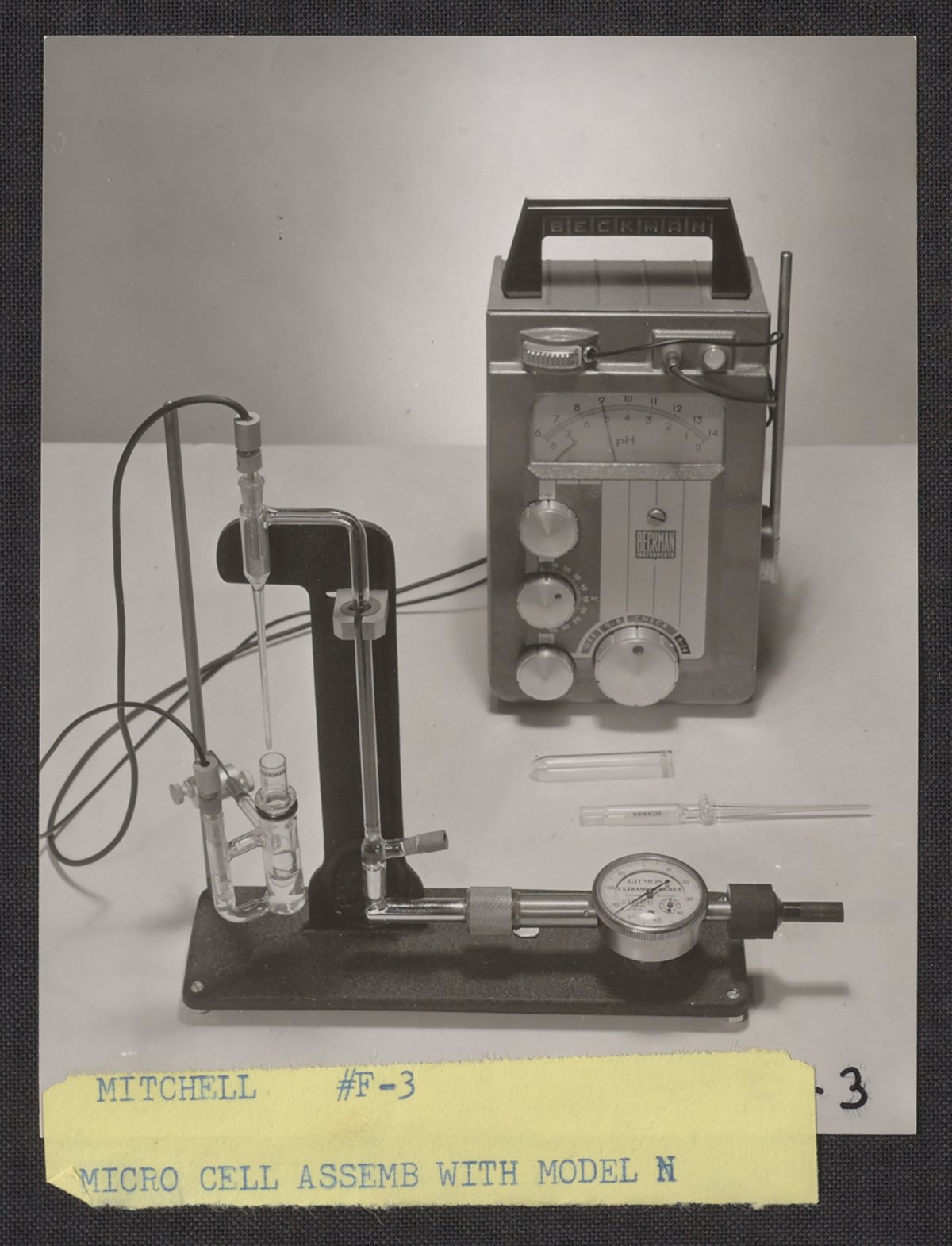Preston E. Mitchell Commercial Photography. “Beckman Model N PH Meter with Micro Cell Assembly,” n.d. Beckman Historical Collection, Box 86. Science History Institute. Philadelphia. https://digital.sciencehistory.org/works/0z708w80b.