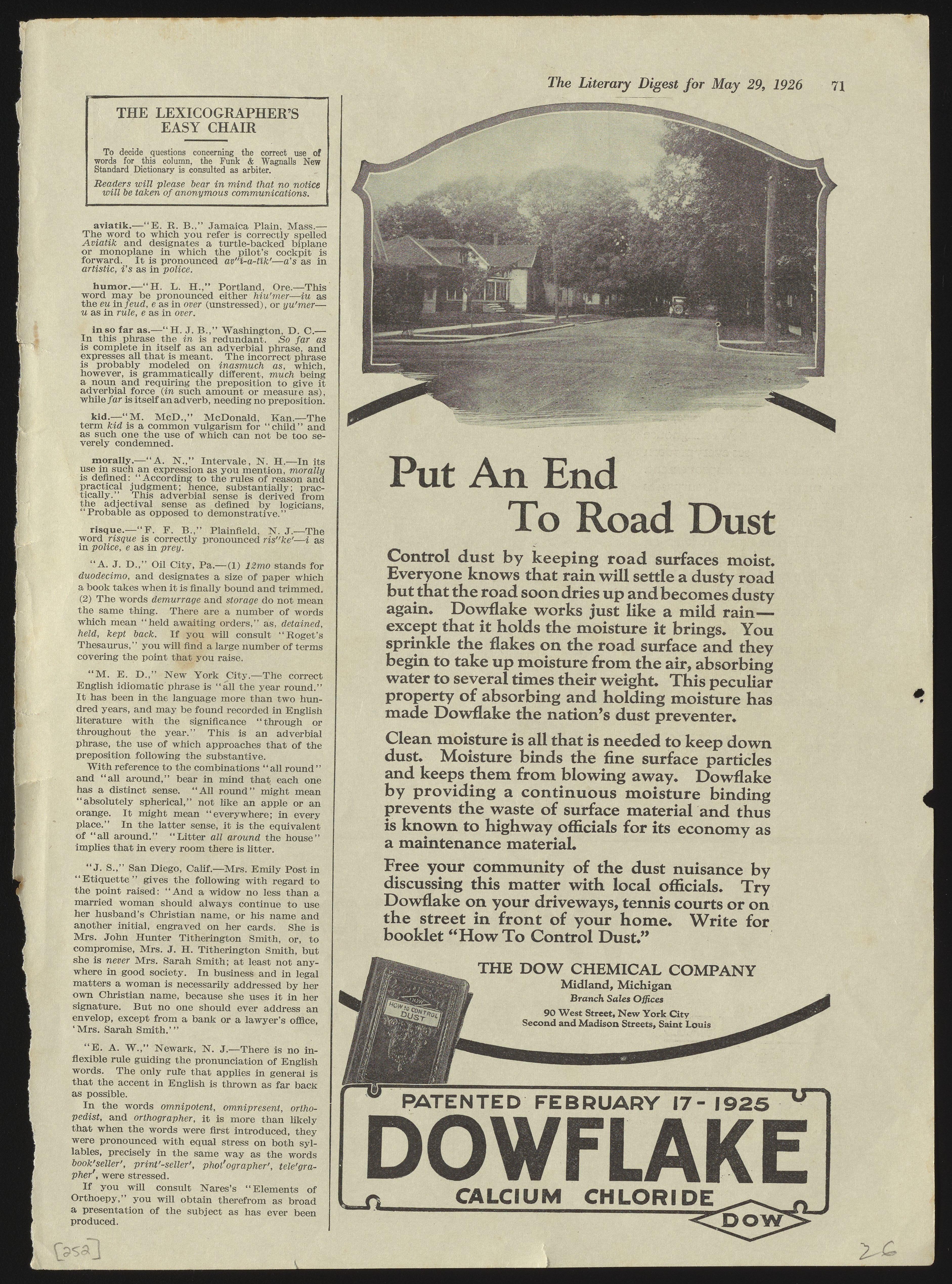 Advertisement for Dowflake Calcium Chloride, a product of the Dow Chemical Company, with view of a tree-lined residential street and unpaved road. Patented on February 17, 1925, Dowflake was marketed for use to control dust on unpaved roads and parking lots, as well as a roadway deicer. This advertisement appeared on page 71 of the May 29, 1926 edition of The Literary Digest .