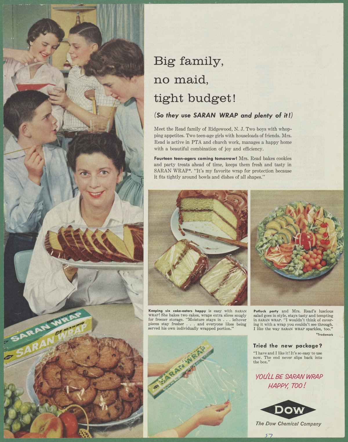 Color print advertisement for Saran Wrap, a product of the Dow Chemical Company. The advertisement profiles the Read family of Ridgewood, New Jersey and features photographic reproductions of various cookies and party treats wrapped in Saran Wrap to lock in freshness and moisture. Initially developed for the U.S. Army to wrap arms and equipment for transport during World War II, saran plastic was subsequently developed and marketed as Saran Wrap for household use.