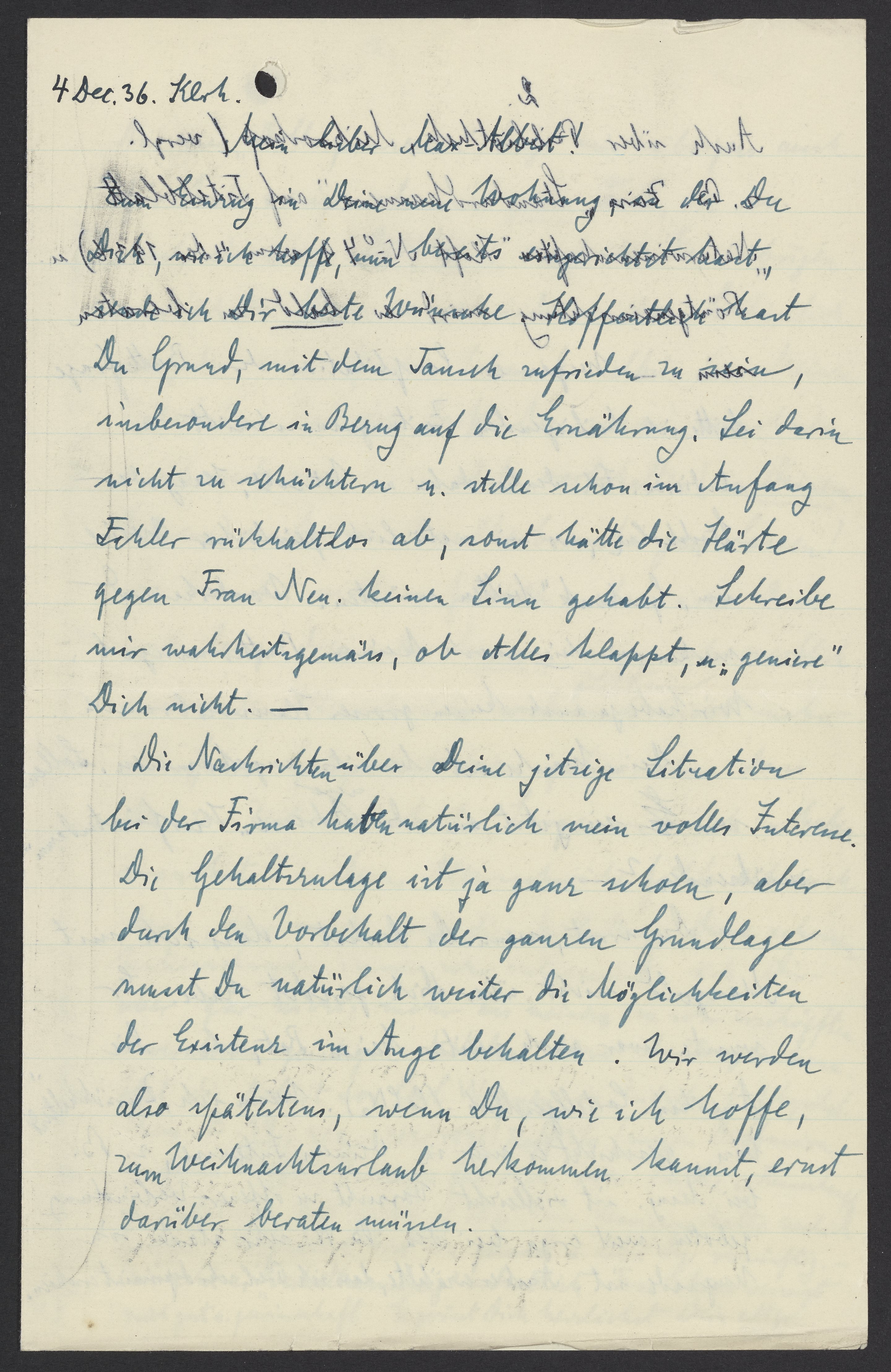 Die Nachrichten über Deine jetzige Sitation bei der Firma haben natürlich mein volles Interesse. Die Gehaltszulage ist ja ganz schön, aber durch den Vorbehalt der ganzen Grundlage musst Du natürlich weiter die Möglichkeiten der Existenz im Auge behalten. Wir werden also spätestens, wenn Du, wie ich hoffe, zum Weihnachtsurlaub herkommen kannst, erst darüber beraten müssen.