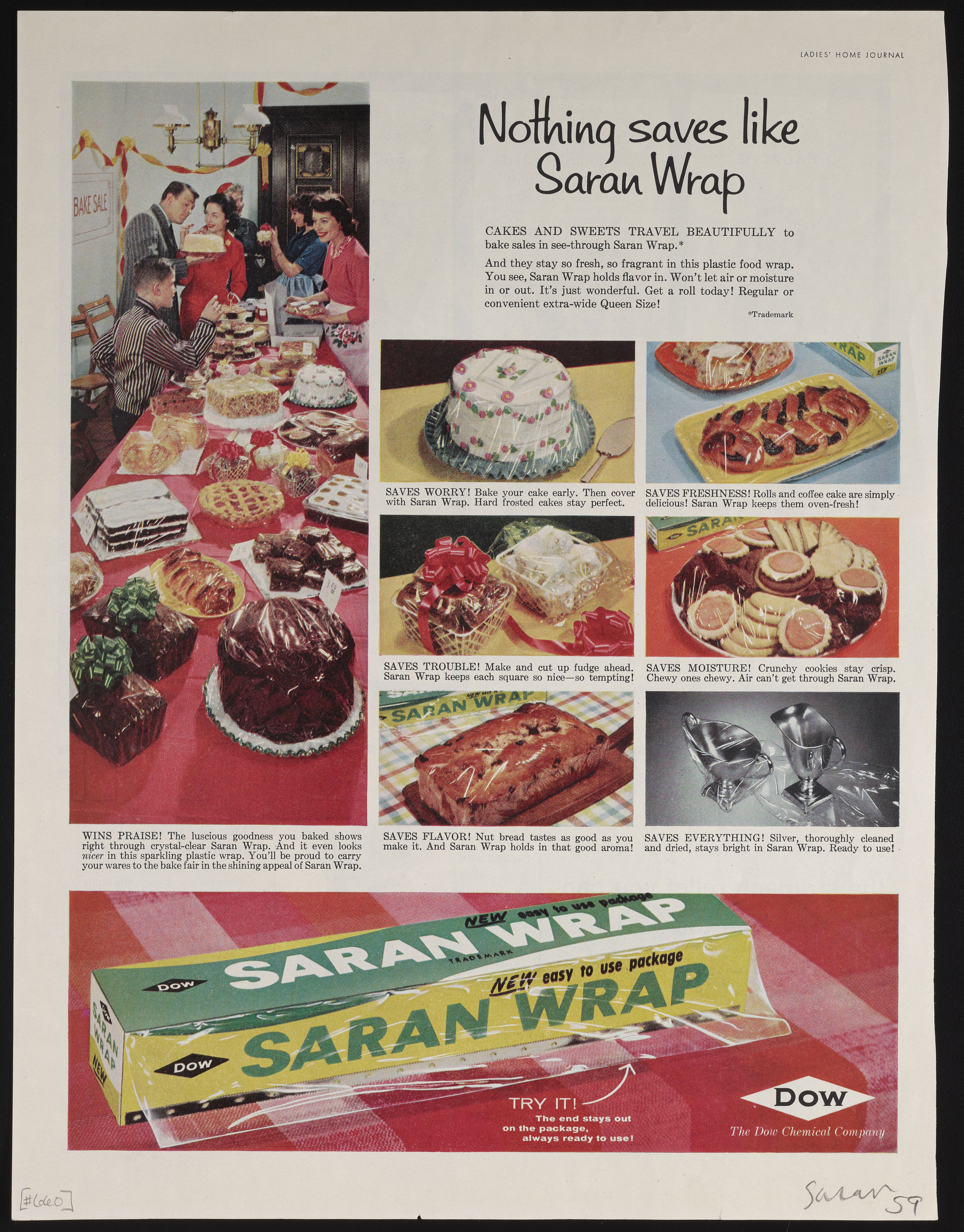 Color print advertisement for Saran Wrap, a product of the Dow Chemical Company. The advertisement features a photograph of a table at a bake sale, covered with baked goods wrapped in Saran. Smaller photographs highlight individual baked goods as well as a package of Saran Wrap. The accompanying text describes the benefits of using Saran for food packaging. This advertisement appeared on page 154 of the October 1959 edition of Ladies' Home Journal.