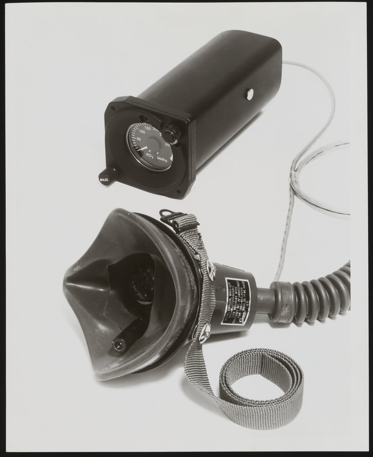 Beckman made hypoxia warning systems for aircraft pilots and astronauts. An O2 sensor is visible in the mask.