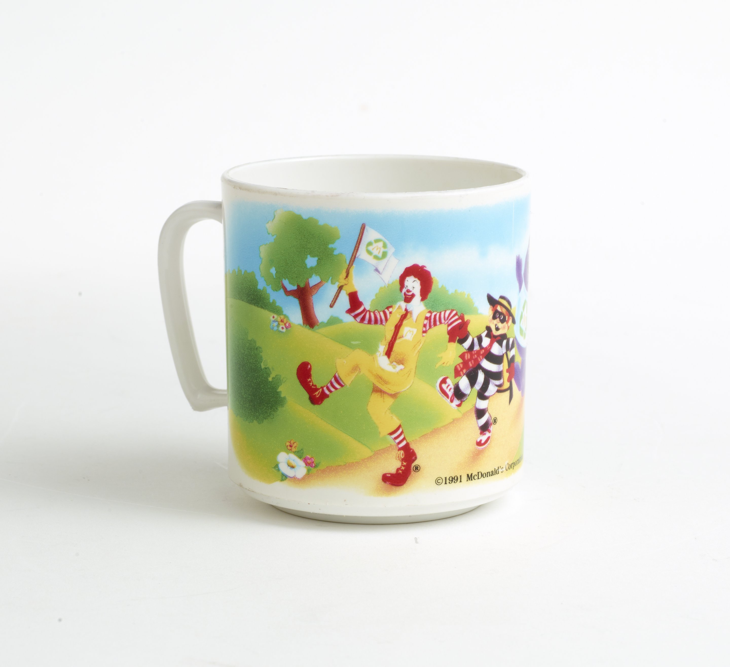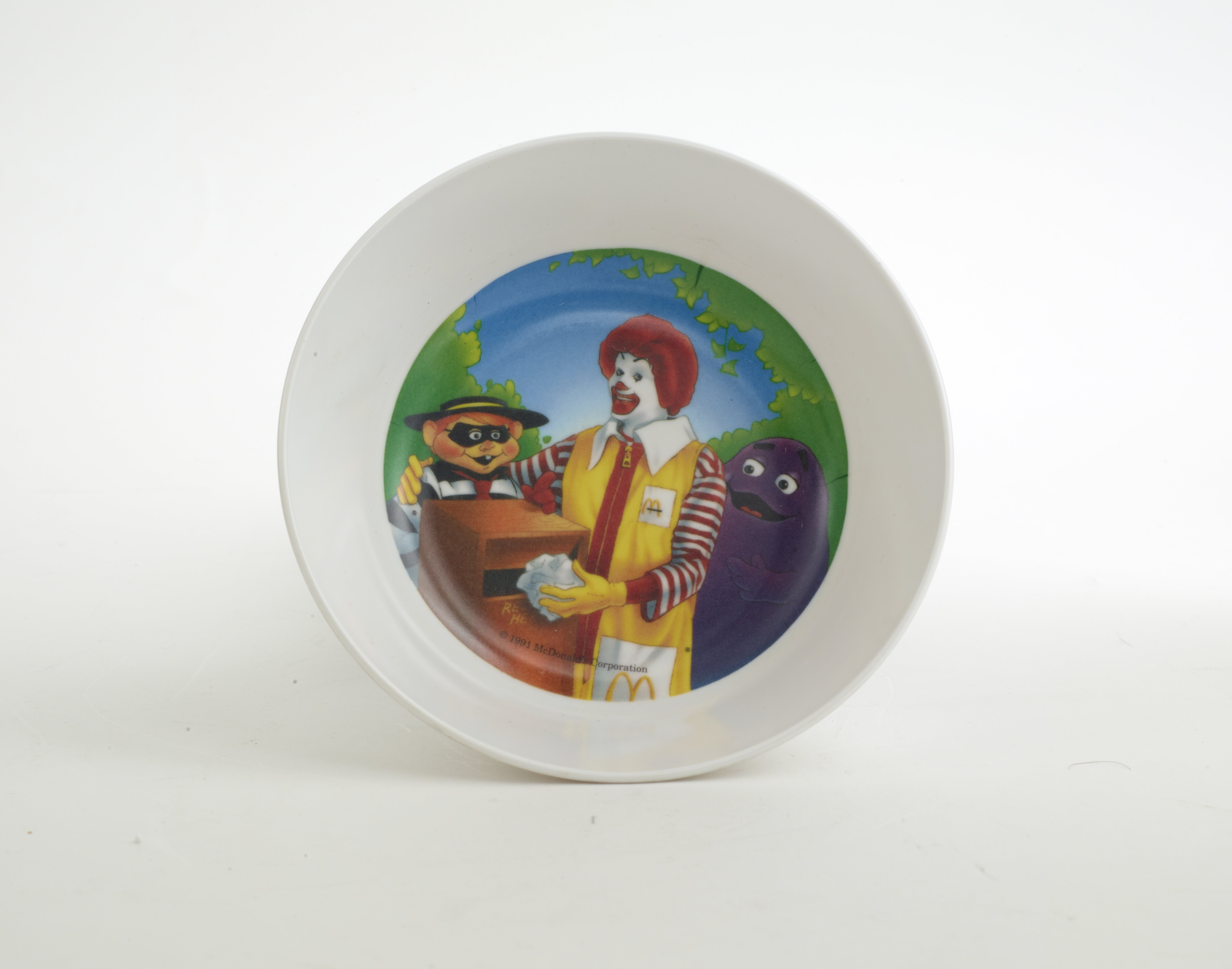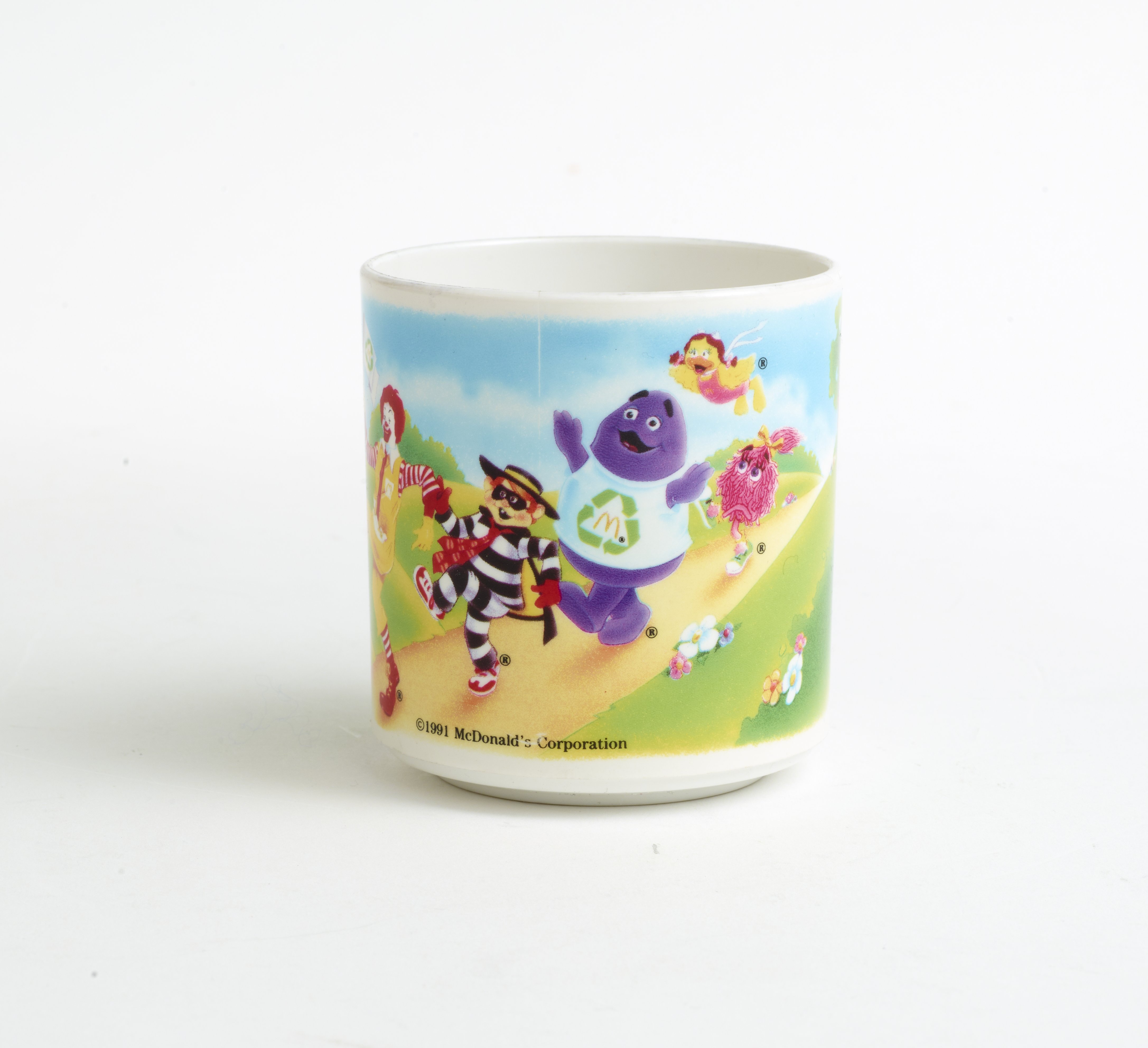 Small JPG1200 x 878px — 112 KBLarge JPG2880 x 2108px — 397 KBFull-sized JPG9609 x 7032px — 3.7 MBOriginal fileTIFF — 9609 x 7032px — 193 MBA 3-piece plastic tableware set featuring McDonald's Corporation character mascots, Ronald McDonald, the Hamburgler, Grimace, a pink "Fry Kid", and Birdie the Early Bird. The characters are promoting the eco-friendly habit of recycling.