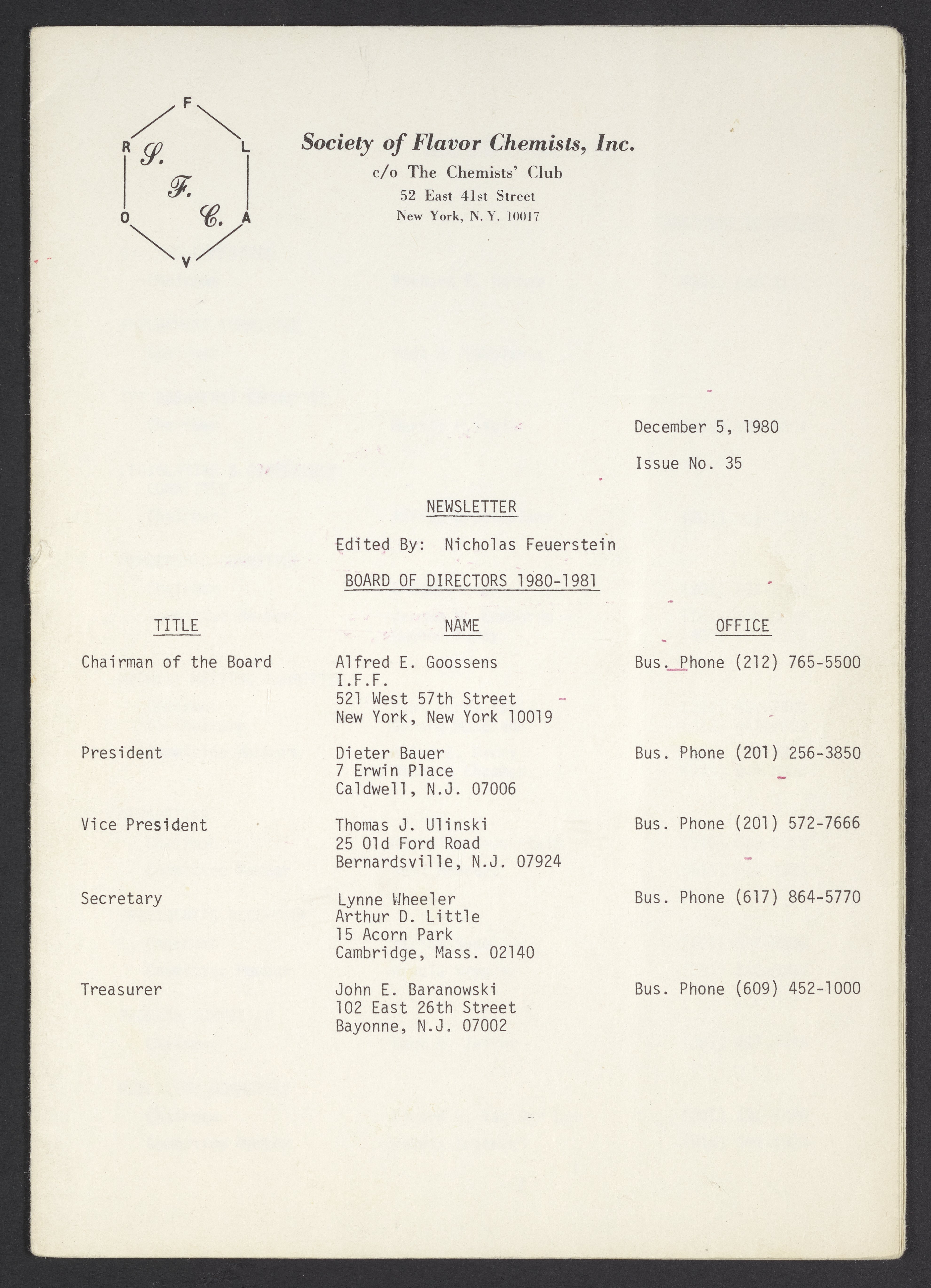 Small JPG1200 x 1658px — 210 KBLarge JPG2880 x 3980px — 1.1 MBFull-sized JPG3961 x 5474px — 2.0 MBOriginal fileTIFF — 3961 x 5474px — 62.1 MBDecember 5, 1980 issue of the Society of Flavor Chemists newsletter.