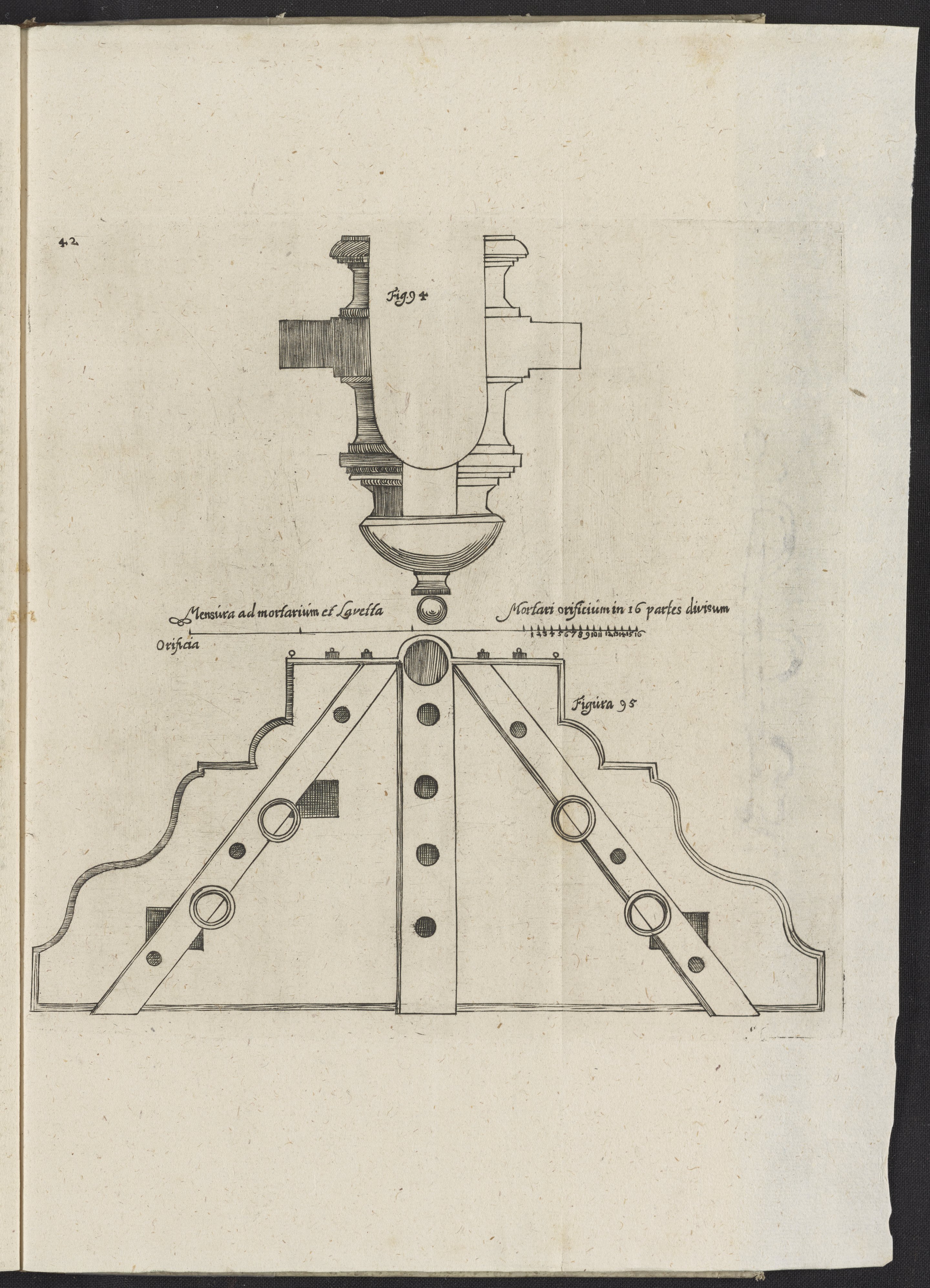 Brawe, Hermann. “Plate 42: Mortar and Carriage.” In Vollenkommene Unterweisung, Wie Raketen, Feuer- Wasser- Sturm-Kugeln, Granaten, Pech-Sturm-Kräntze, Und Allerhand Lust Und Ernsthaffte Feuer-Wercke Zubereiten. Osnabrück, Germany: Johann Georg Schwänder, 1660. https://digital.sciencehistory.org/works/1544bp10f.