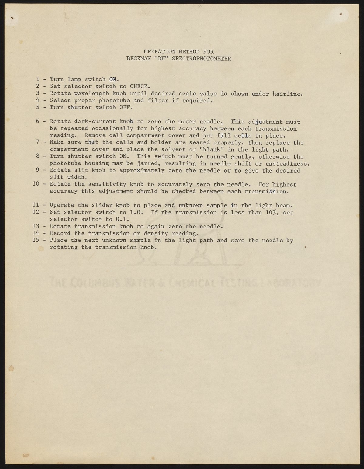 The watermark on the paper indicates that these directions may have been written by the Columbus Water and Chemical Testing Laboratory.