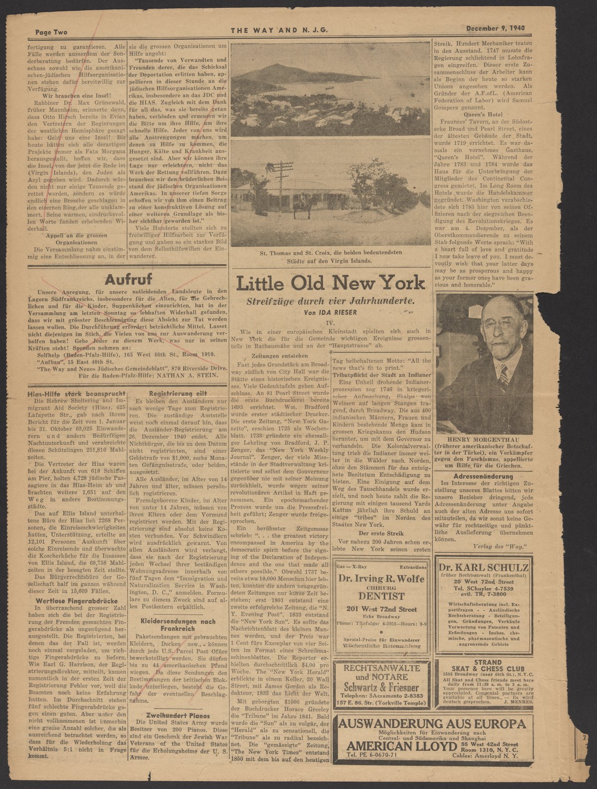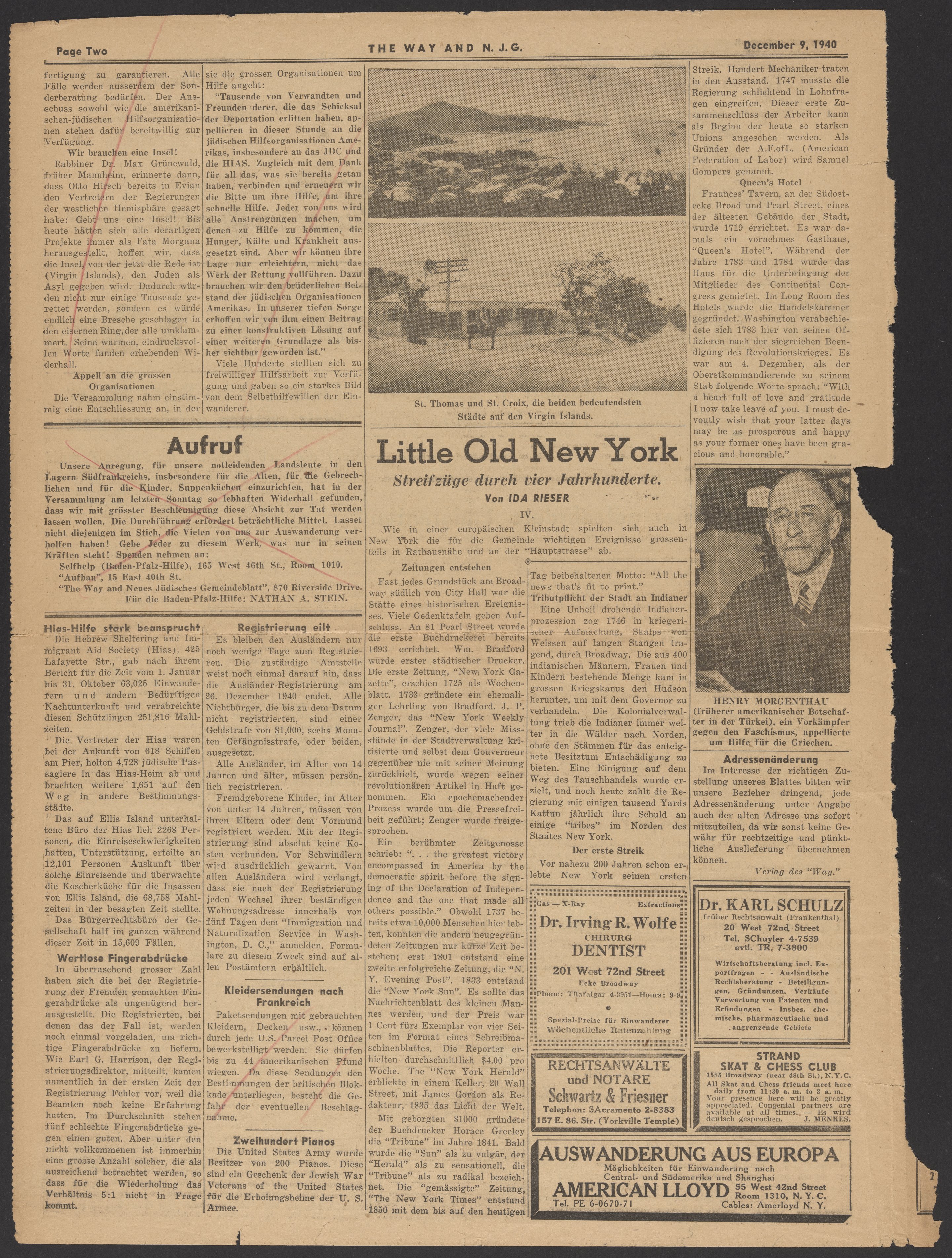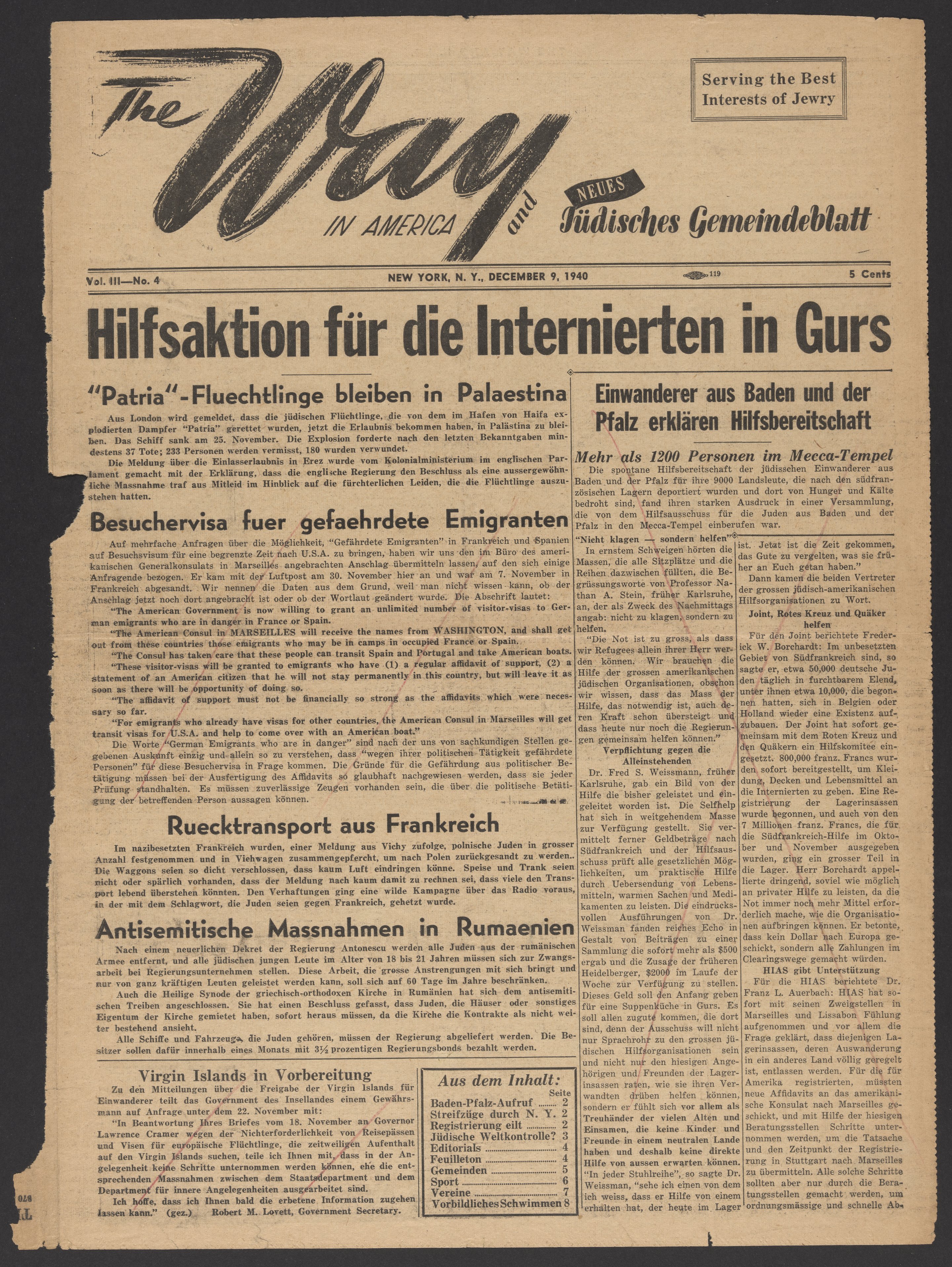 Page one and two of The Way in America and Neues Jüdisches Gemeindeblatt, Volume III, No. 4, published on December 9, 1940.