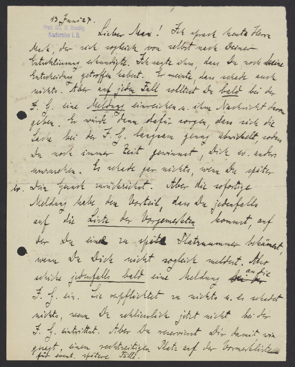 Ich sprach heute Herrn Mark, der sich sogleich von selbst nach Deiner Entschliessung erkundigte. Ich sagte ihm, dass Du noch keine Entscheidung getroffen habest. Er meinte, dass schade auch nichts. Aber auf jeden Fall solltest Du bald bei der I.G. eine Meldung einreichen u. ihm Nachricht davon geben. Er würde dann dafür sorgen, dass sich die Sache bei der I.G. lansamg genug abwickelt, sodass Du noch immer Zeit gewinnst, Dich ev. anders umzusehen. Es schade gar nichts, wenn Du später ev. Dein Gesuch zurückziehst. Aber die sofortige Meldung habe den Vorteil, dass Du jedenfalls auf die Liste der Vorgemerkten kommst, auf der Du eine zu späte Platznummer bekämest, wenn Du Dich nicht sogleich meldest. Also shicke jedenfalls bald eine Meldung an die I.G. ein. Sie verpflichtet zu nichts u. es schadet nichts, wenn Du schliesslich jetzt nicht bei der I.G. eintrittst. Aber Du reservierst Dir damit, wie gesagt, einen rechtzeitigen Platz auf der Vormerkliste für event. spätere Fälle.