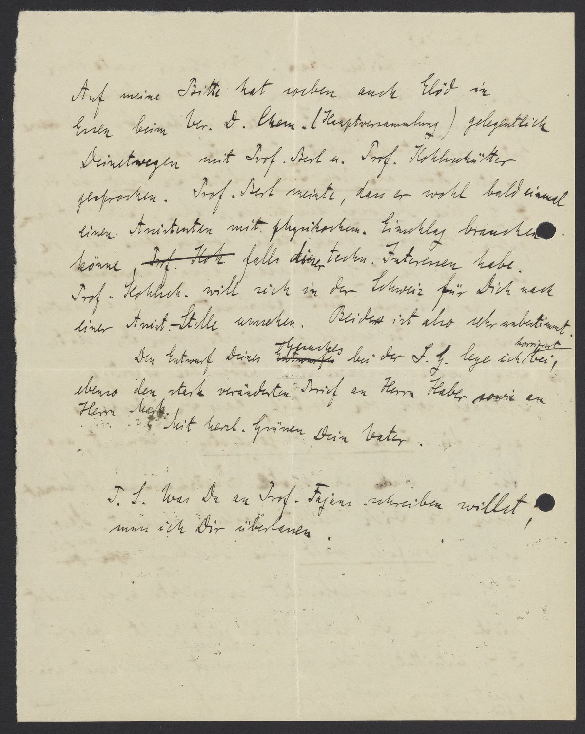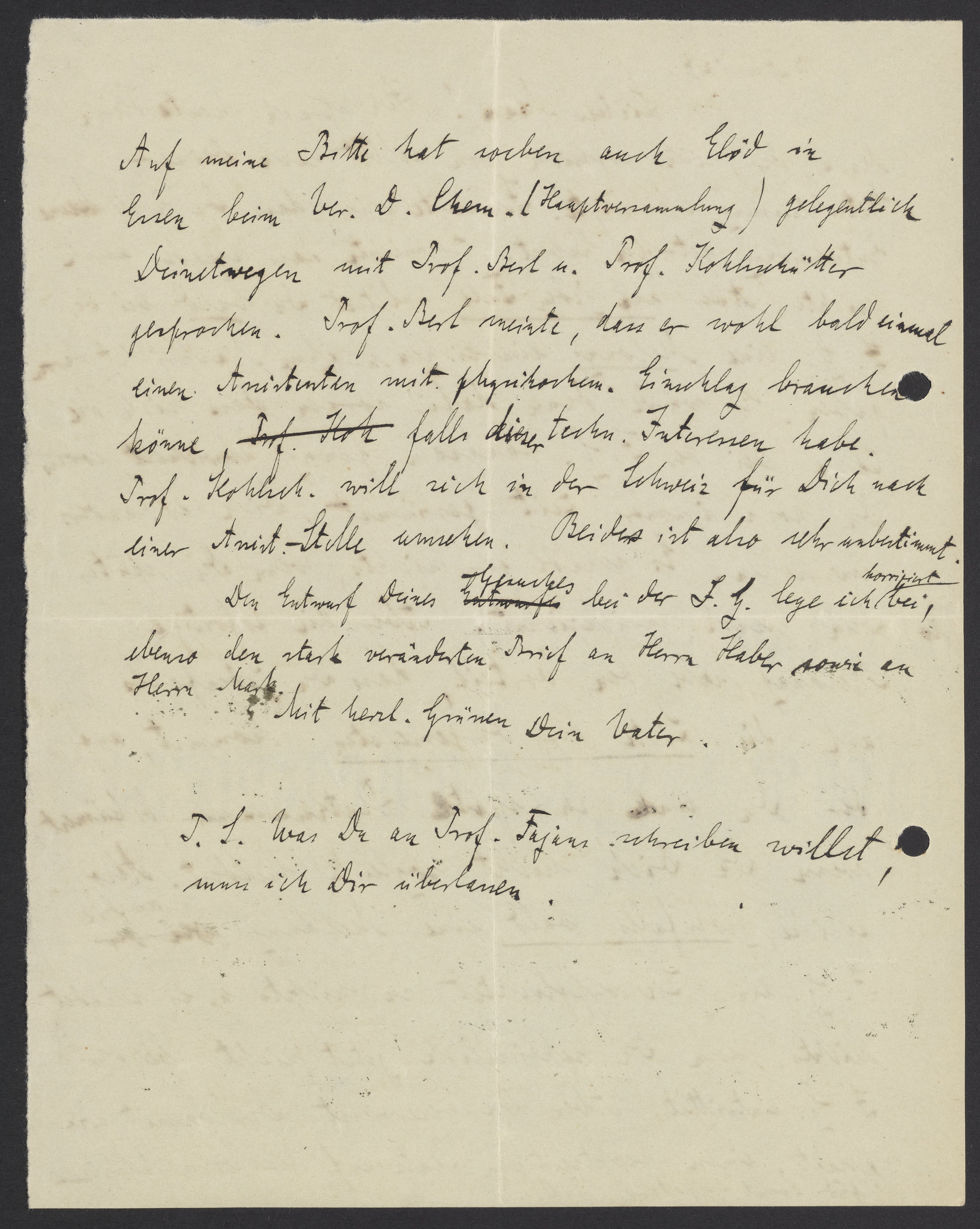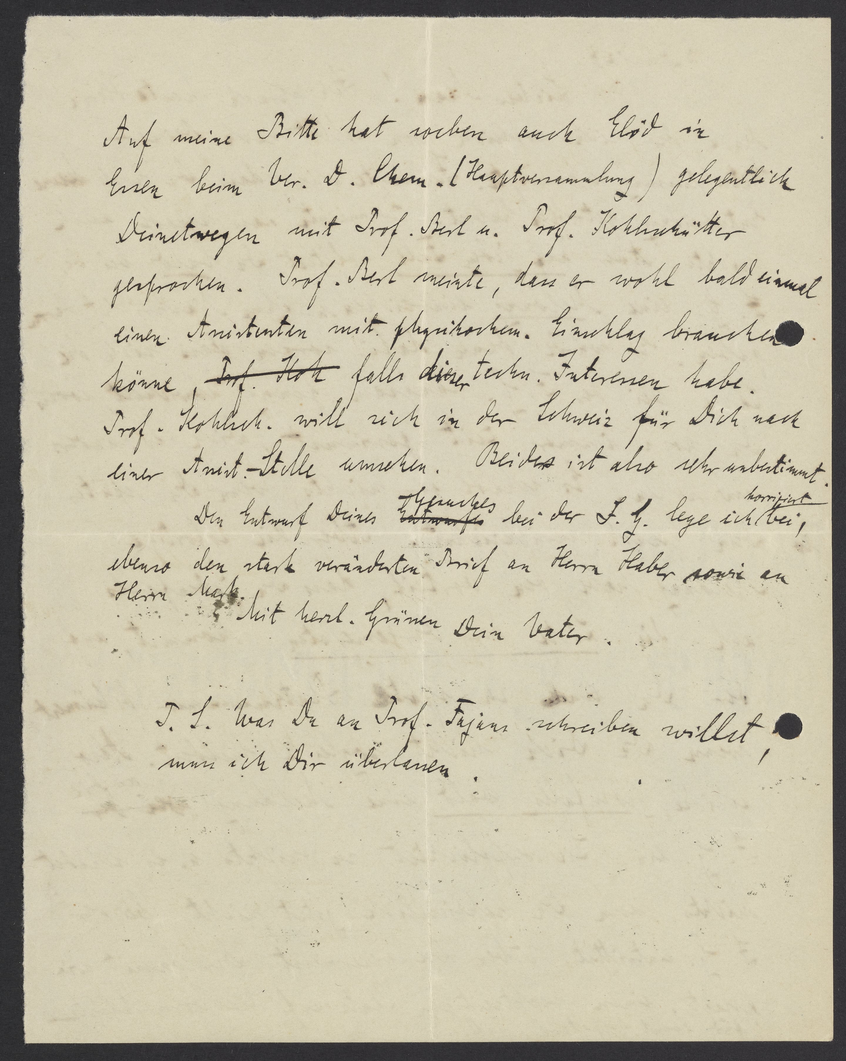 Auf meiner Bitte hat soeben auch Elöd in Essen beim Ver. D. Chem. (Hauptversammlung) gelegentlich Deinetwegen mit Prof. Berl u. Prof. Kohlschütter gesprochen. Prof. Berl meinte, dass er wohl bald einmal einen Assistenten mit physikalischen Einschlag brauchen könne, falls dieser techn. Interessen habe. Prof. Kohlsch. will sich in der Schweiz für Dich nach einer Assist.-Stelle umsehen. Beides ist also sehr unbestimmt.