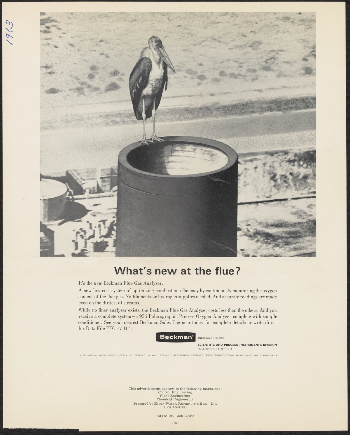 Erwin Wasey, Ruthrauff, and Inc. Beckman Instruments. “What's New at the Flue?,” 1963. Beckman Historical Collection, Box 49, Folder 21. Science History Institute. Philadelphia. https://digital.sciencehistory.org/works/1831cj94h.