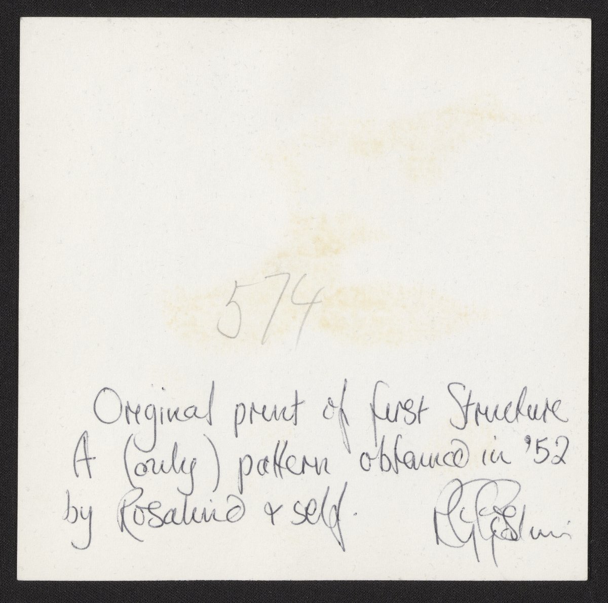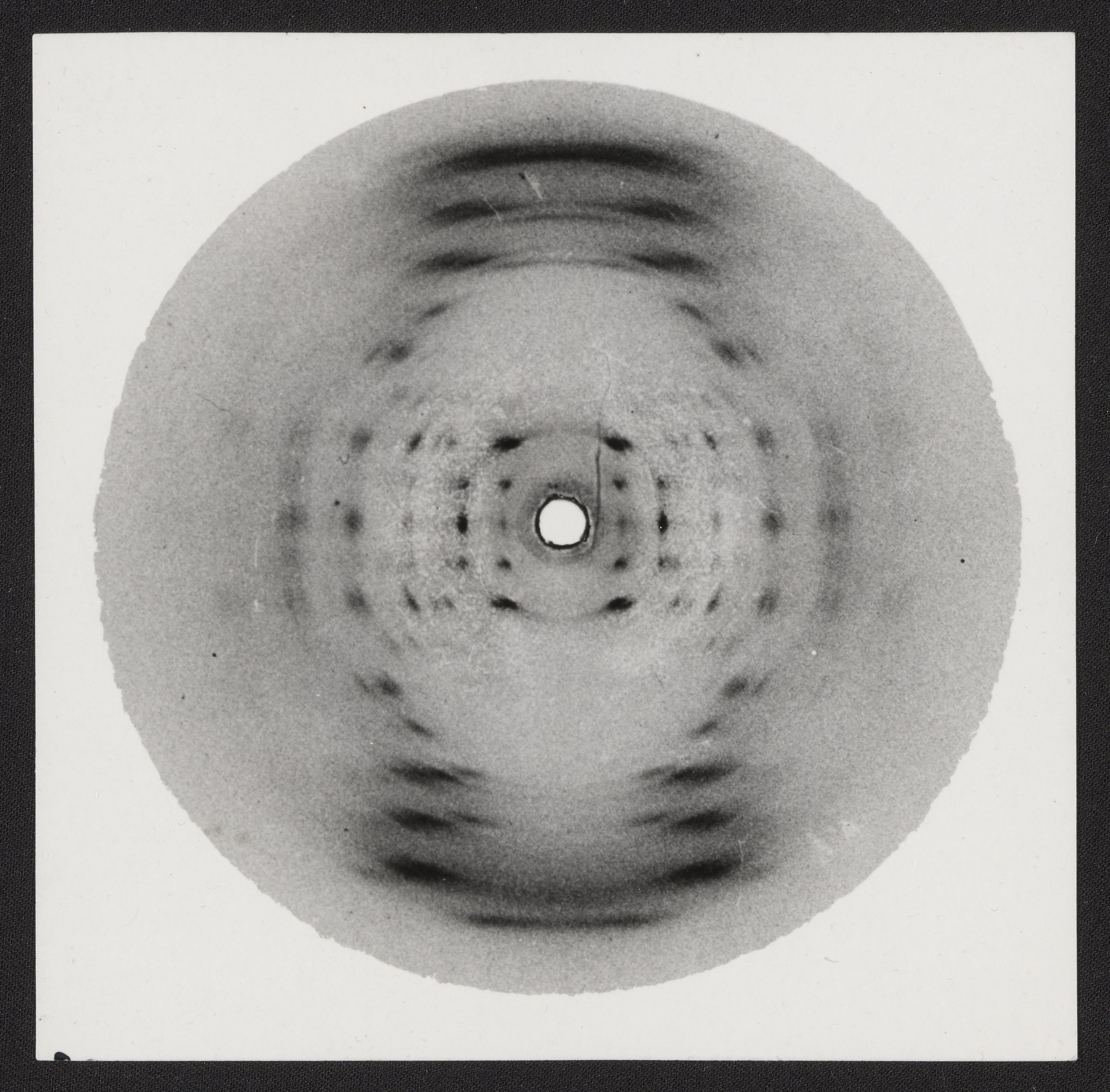 Small JPG1200 x 1180px — 210 KBFull-sized JPG2733 x 2687px — 865 KBOriginal fileTIFF — 2733 x 2687px — 21.0 MBPhotographic print of X-ray diffraction image of DNA in the "A" form with annotation by Raymond Gosling (1926-2015). The original image was made by Rosalind Franklin (1920-1958) and her student Raymond Gosling (1926-2015) at King’s College London in 1952. It was published by Franklin and Gosling in the July 1953 issue of Nature, which described the A-form of DNA. The photo is annotated on the reverse by Gosling in ink and reads, “Original print of first structure A (only) pattern obtained in '52 by Rosalind & self. R.G. Gosling."