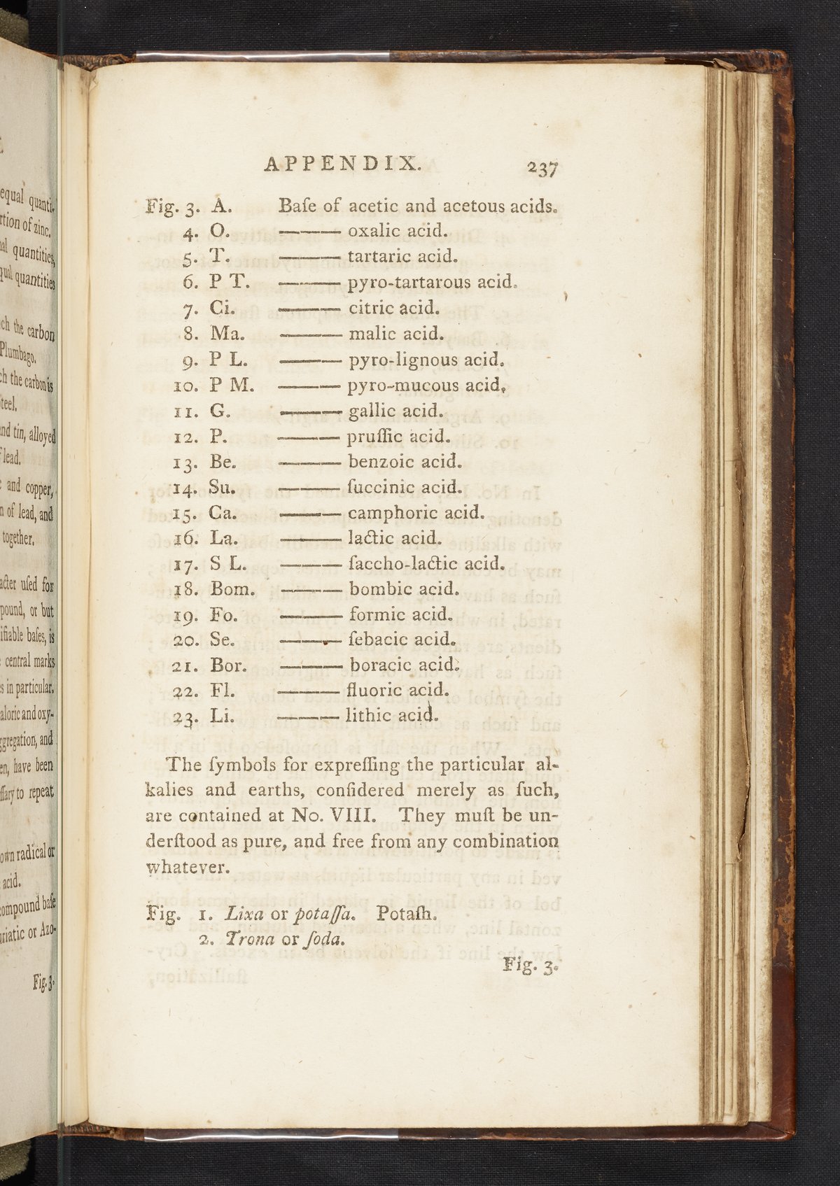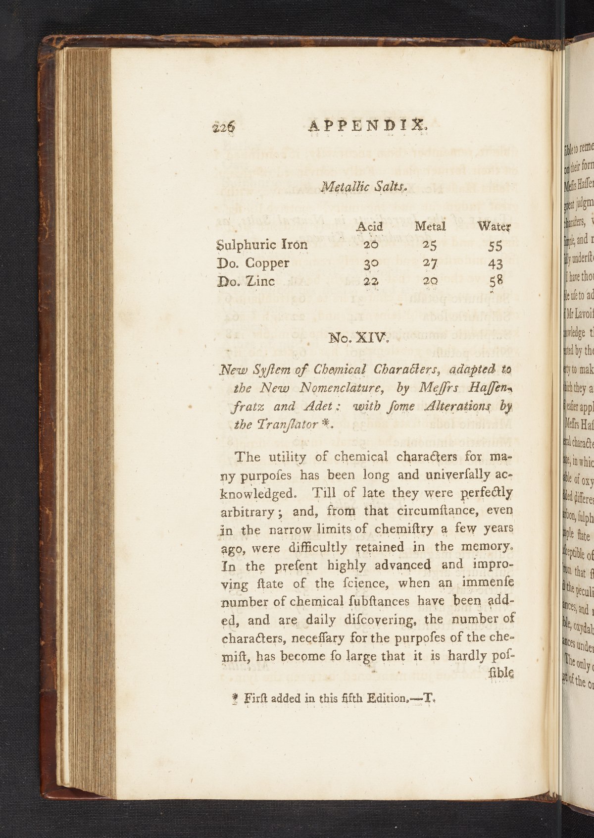 This edition included so many additions that it was necessary to divide it into two volumes. The appendix and addenda (pp. 226–255) contain the majority of the new material, including the first English translation of a paper by Jean Henri Hassenfratz (1755-1827) and Pierre-Auguste Adet (1763-1834), New System of Chemical Characters, adapted to the New Nomenclature, by Messrs Hassenfratz and Adet: with some Alterations by the Translator. Plate XIV illustrates the chemical symbols created by Hassenfratz and Adet. The addenda contain details on the newly discovered element columbium (i.e., niobium), carbon monoxide, nitrous oxide, and lactic acid, taken from A System of Chemistry (Edinburgh, 1802) by Thomas Thomson (1773-1852). Digitized content includes the work's appendix and plate XIV.