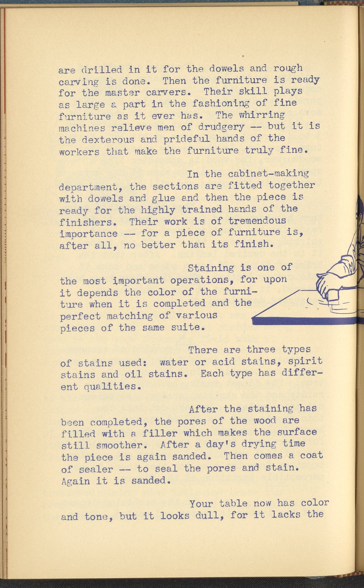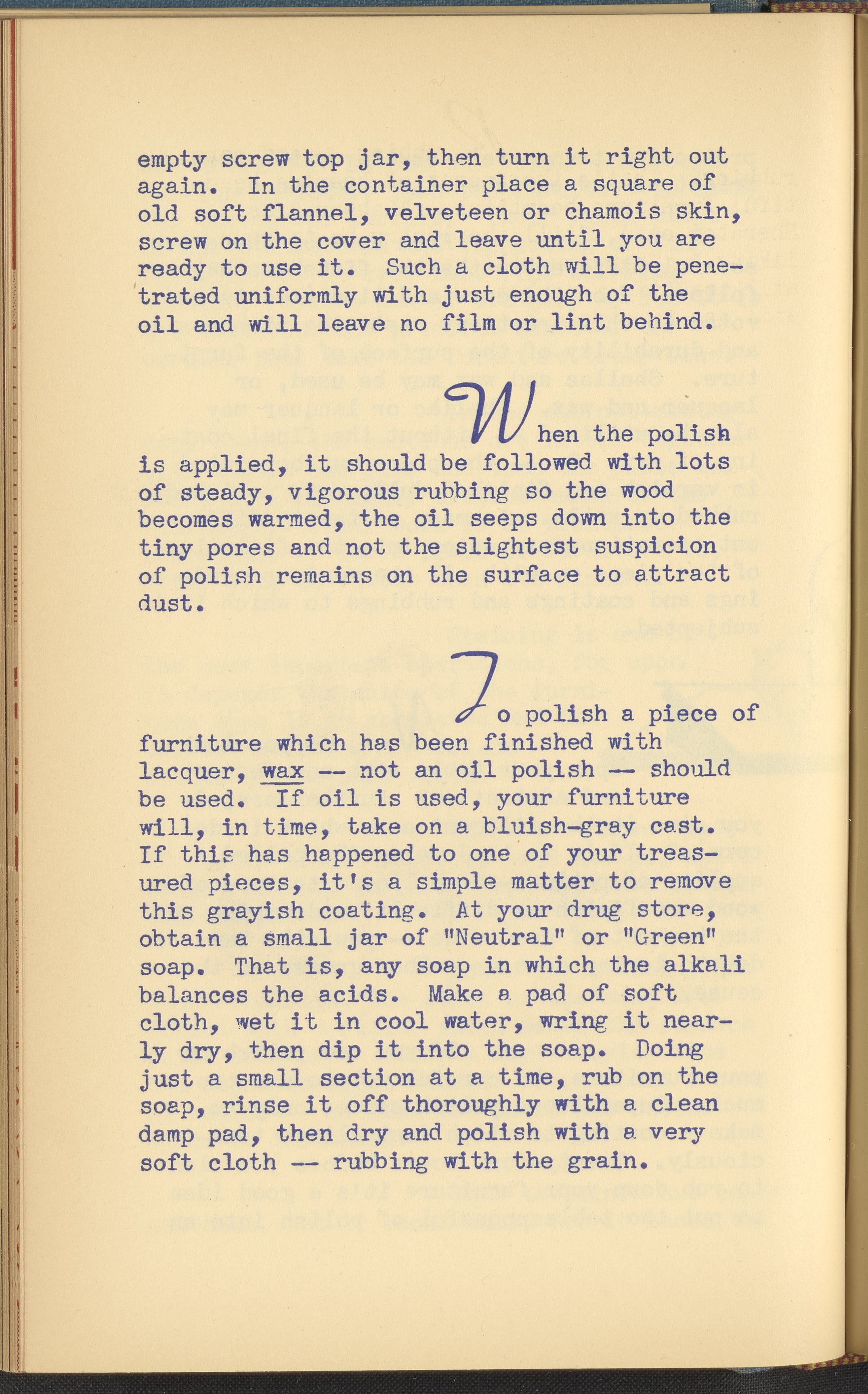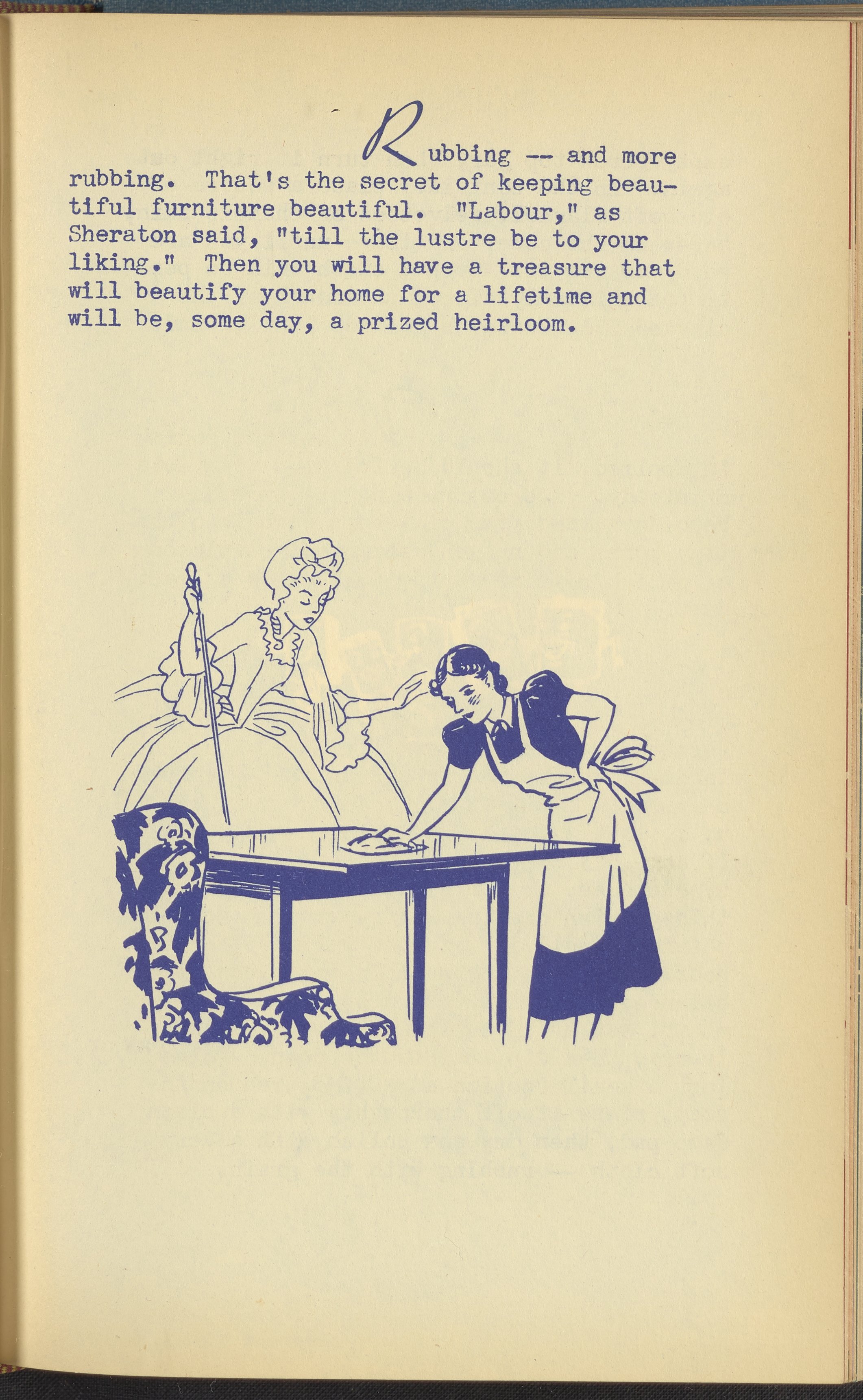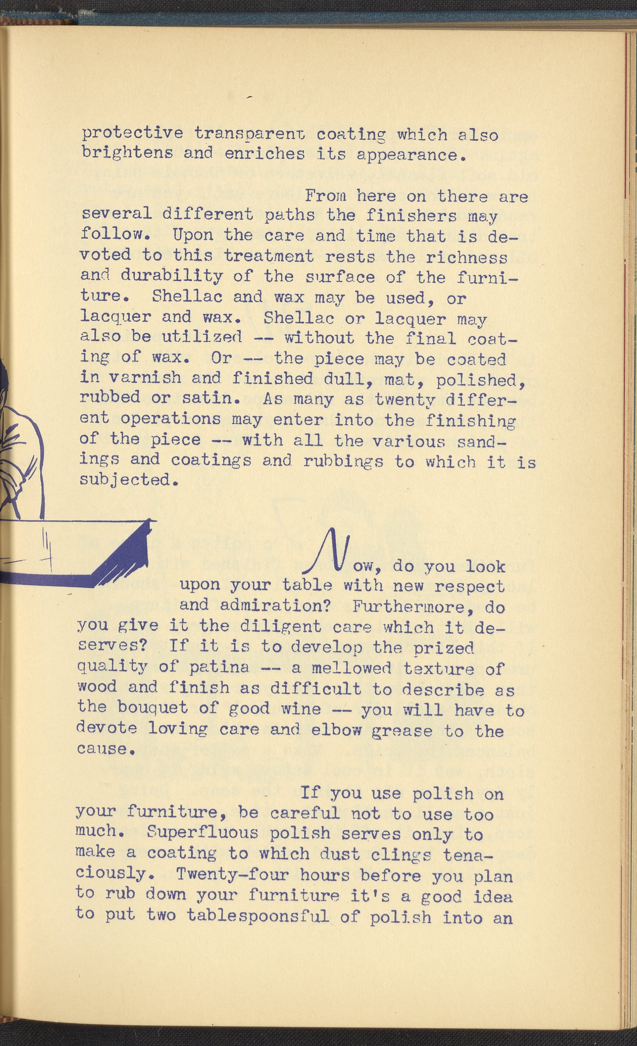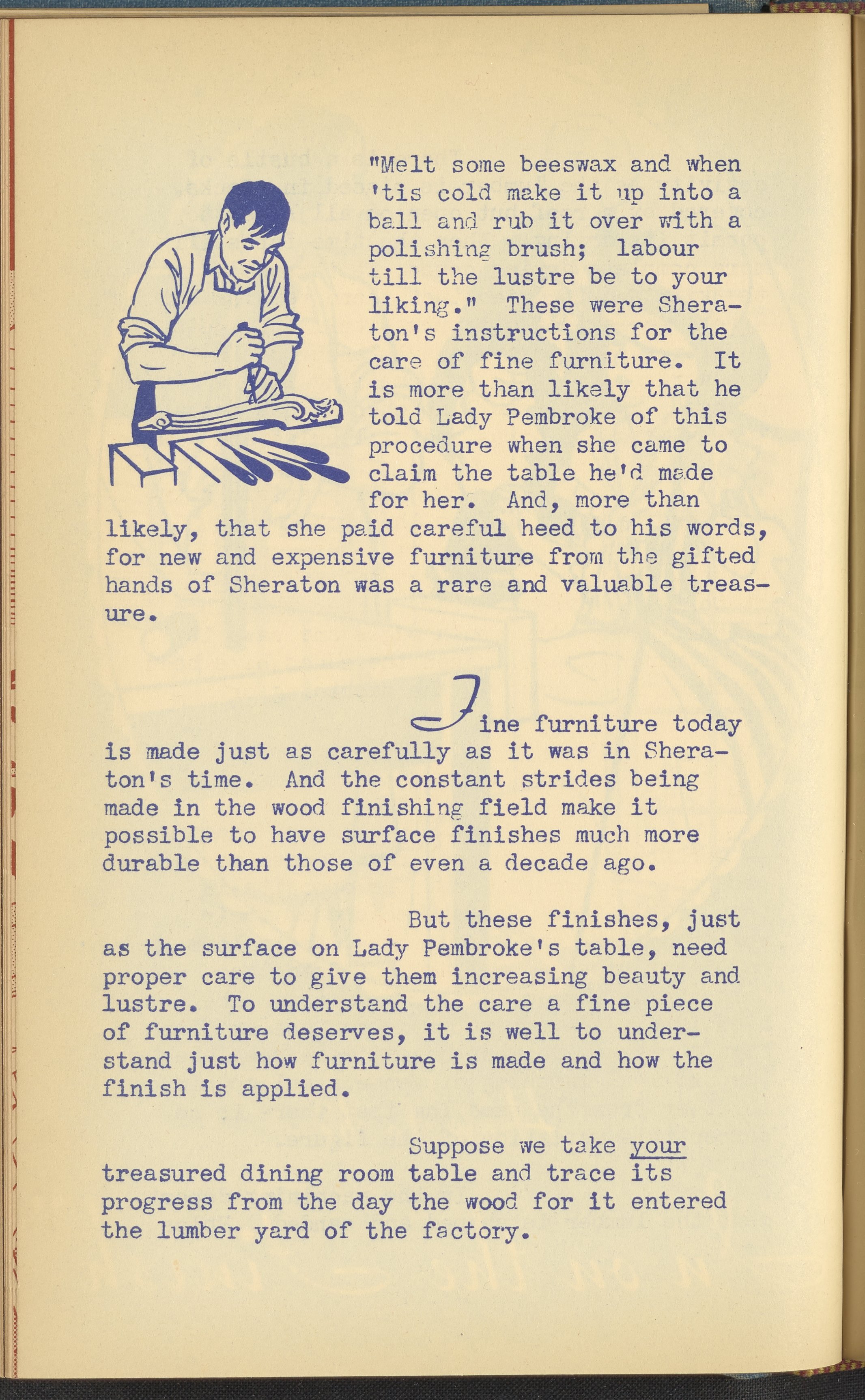 Booklet corresponding to a radio broadcast program created by the National Paint, Varnish, and Lacquer Association. The booklet discusses how to care for wooden furniture. Describes veneers, staining, polish, and other coatings for preserving furniture. Provides tips and tricks for polishing a piece of wooden furniture. Includes small stylized illustrations throughout and decorated covers.
