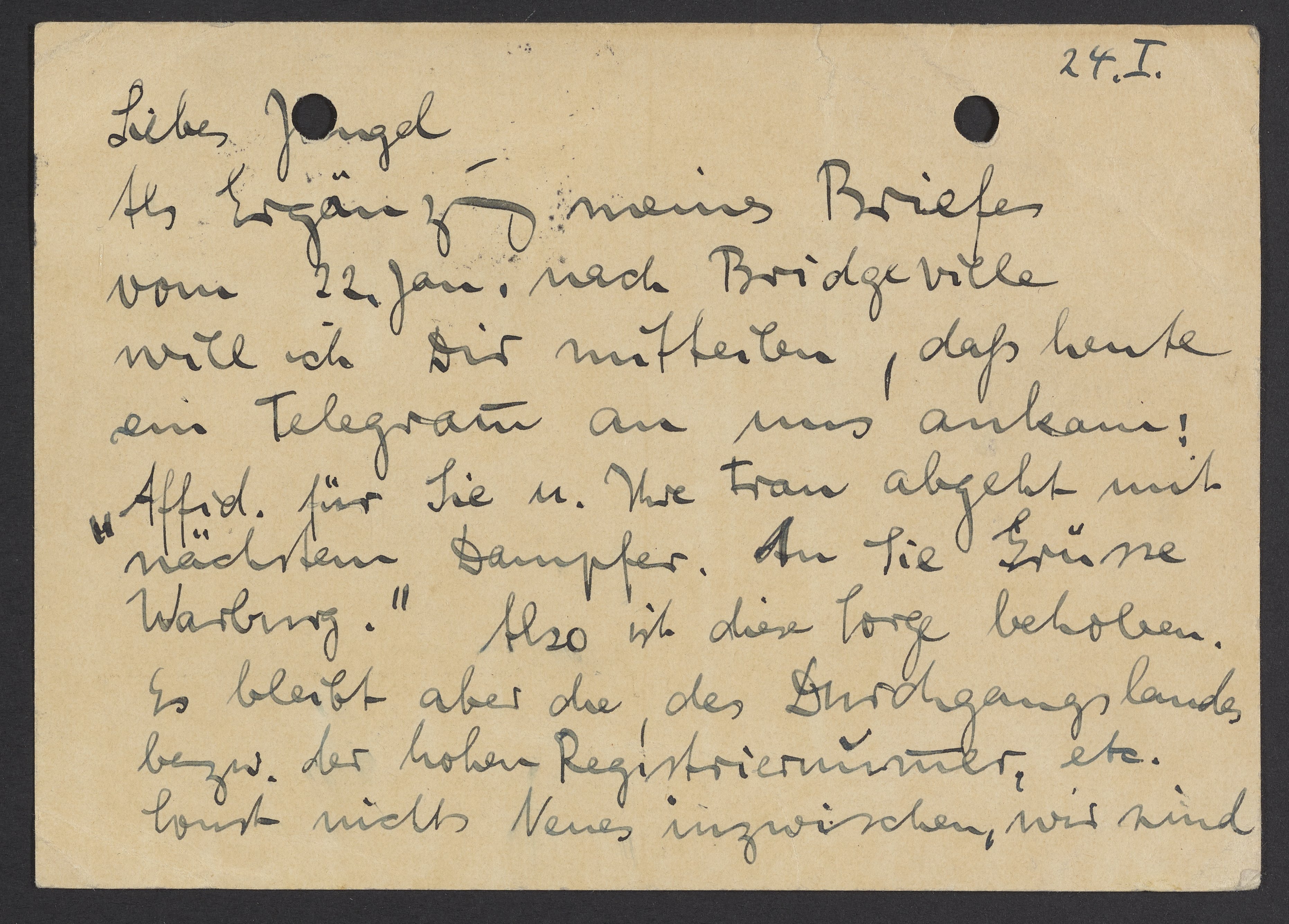 Als Ergänzung meines Briefes vom 22. Jan. nach Bridgeville (der der hoffentlich nachgeschickt wurde) will ich Dir mitteilen, daß heute ein Telegramm an uns ankam: „Affid. für Sie und Ihre Frau abgeht mit nächstem Dampfer. An Sie Grüsse. Warburg.“ Also ist diese Sorge behoben. Es bleibt aber die, des Durchganglandes bezw. der hohen Registriernummer etc. sonst nichts Neues inzwischen. Wir sind