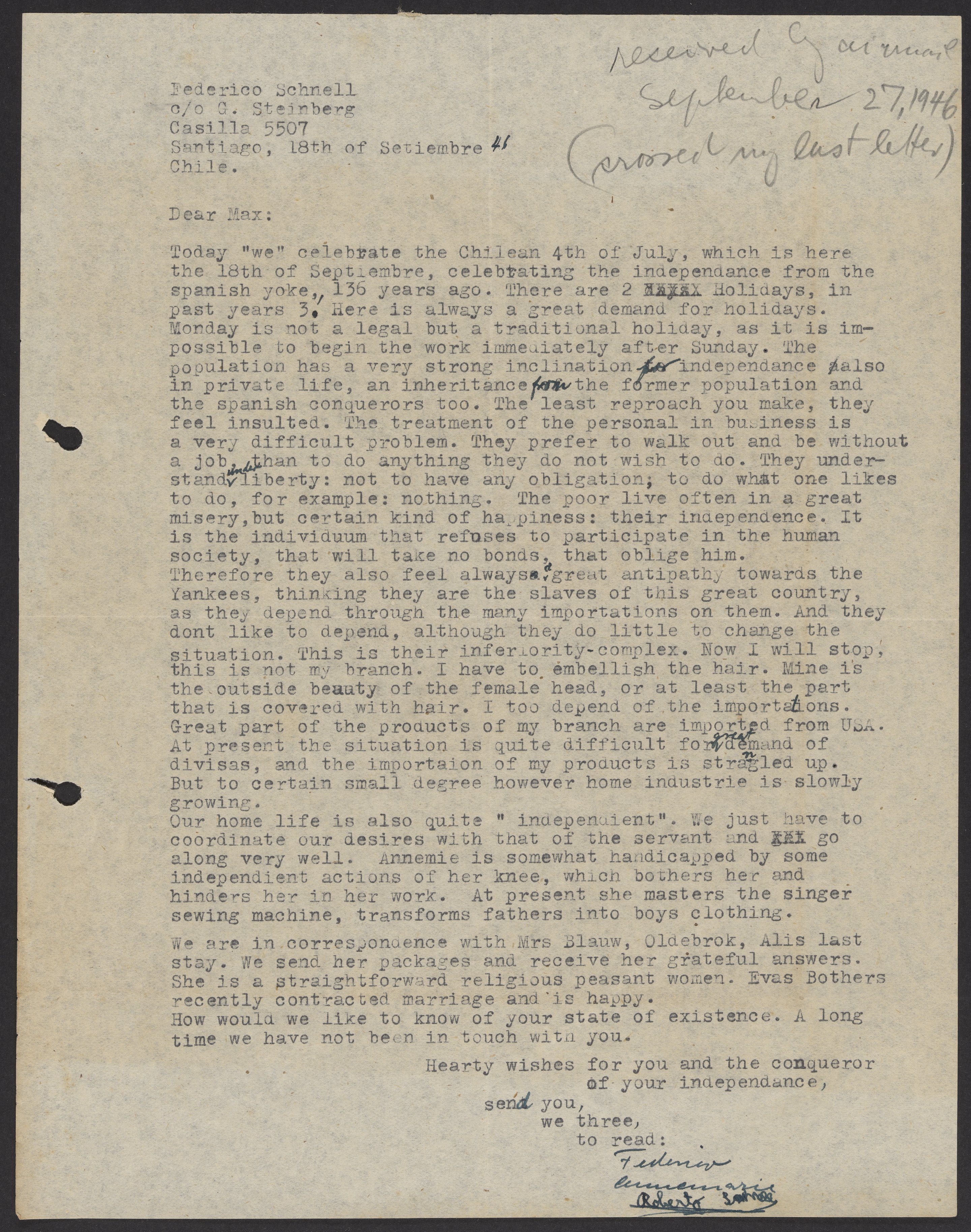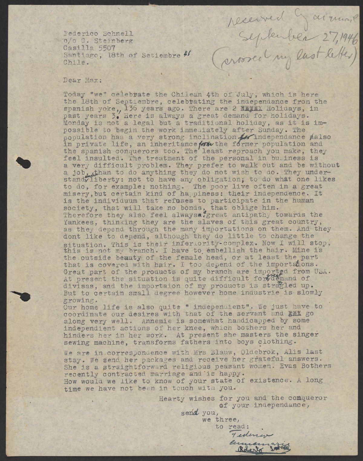 Letter from Federico and Annemarie Schnell to Max Bredig, September 18, 1941