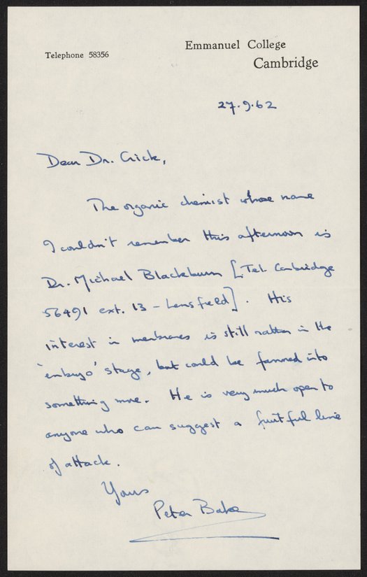 “Letter from Peter Baker to Francis Crick, September 27, 1962,” September 27, 1962. History of Molecular Biology Collection, Box 20, Folder 8. Science History Institute. Philadelphia. https://digital.sciencehistory.org/works/1f0aqp6.