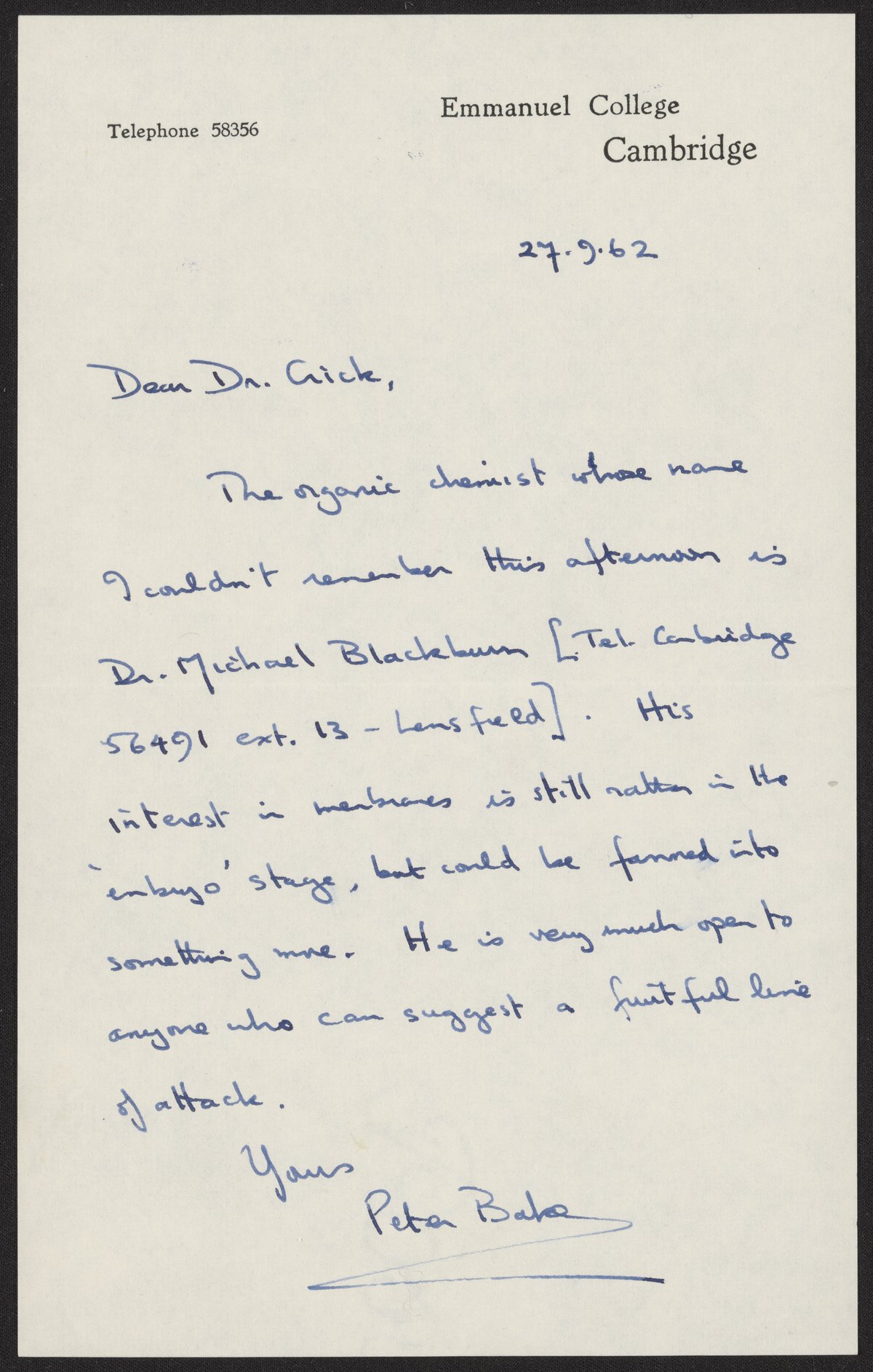 Letter from Peter Baker to Francis Crick, September 27, 1962