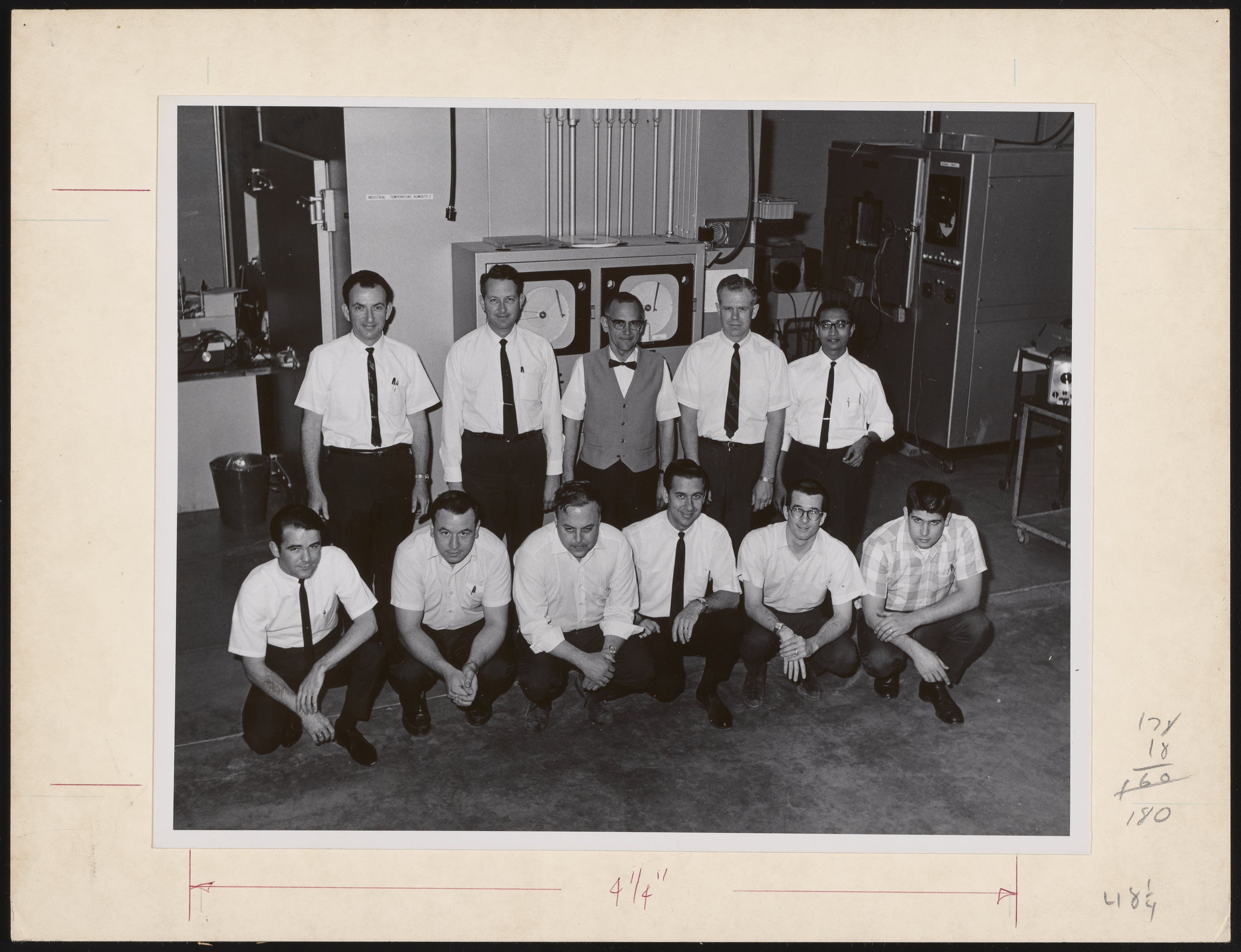 A group of eleven men, standing and crouching indoors in front of various pieces of unidentified scientific equipment.