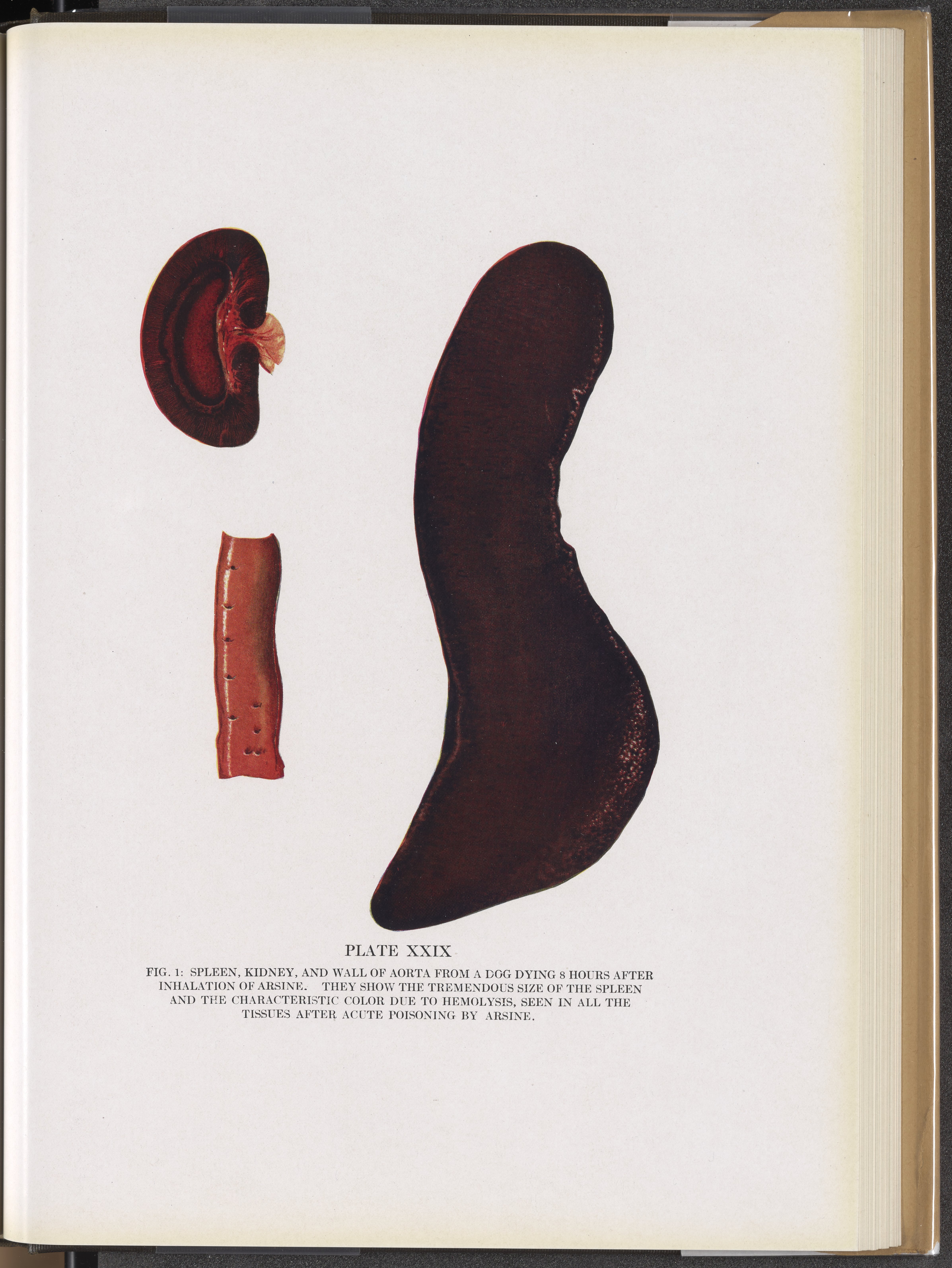 Winternitz, M. C. (Milton C.). “Plate XXIX (Fig. 1): Spleen, Kidney, and Wall of Aorta from a Dog Dying 8 Hours after Inhalation of Arsine.” Collected Studies on the Pathology of War Gas Poisoning. New Haven, Connecticut: Yale University Press, 1920. https://digital.sciencehistory.org/works/1g05fb816.