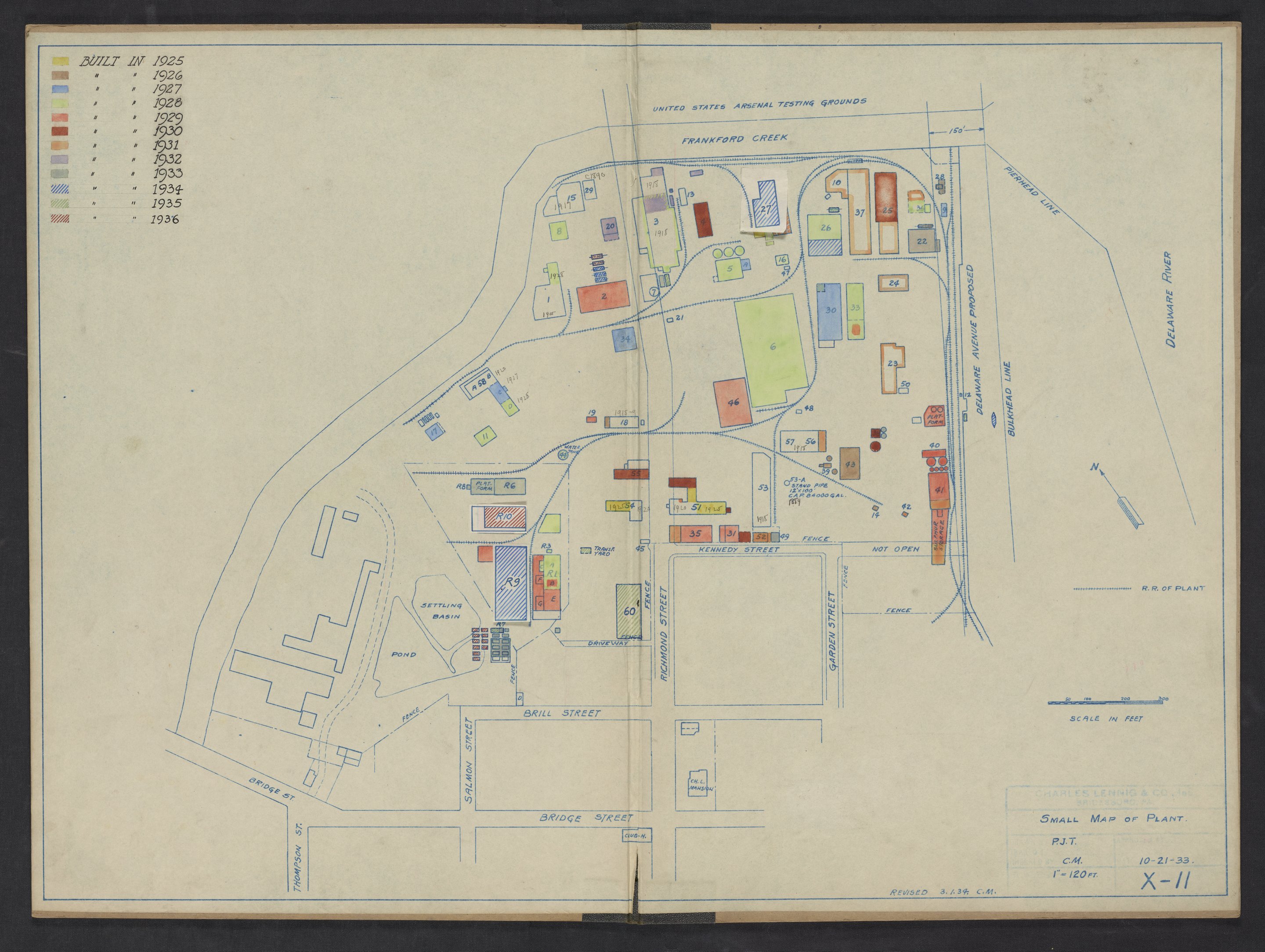 Map depicting the facility and grounds of the Charles Lennig and Company chemical manufacturing plant in Bridesburg, a neighborhood located along the Delaware River in the Northeast section of Philadelphia, Pennsylvania. The map is color-coded to indicate when each building was erected between 1925 and 1936. Charles Lennig and Company operated as a subsidiary of the Rohm and Haas Company, an international chemical company headquartered in Philadelphia, from 1920 to 1947.