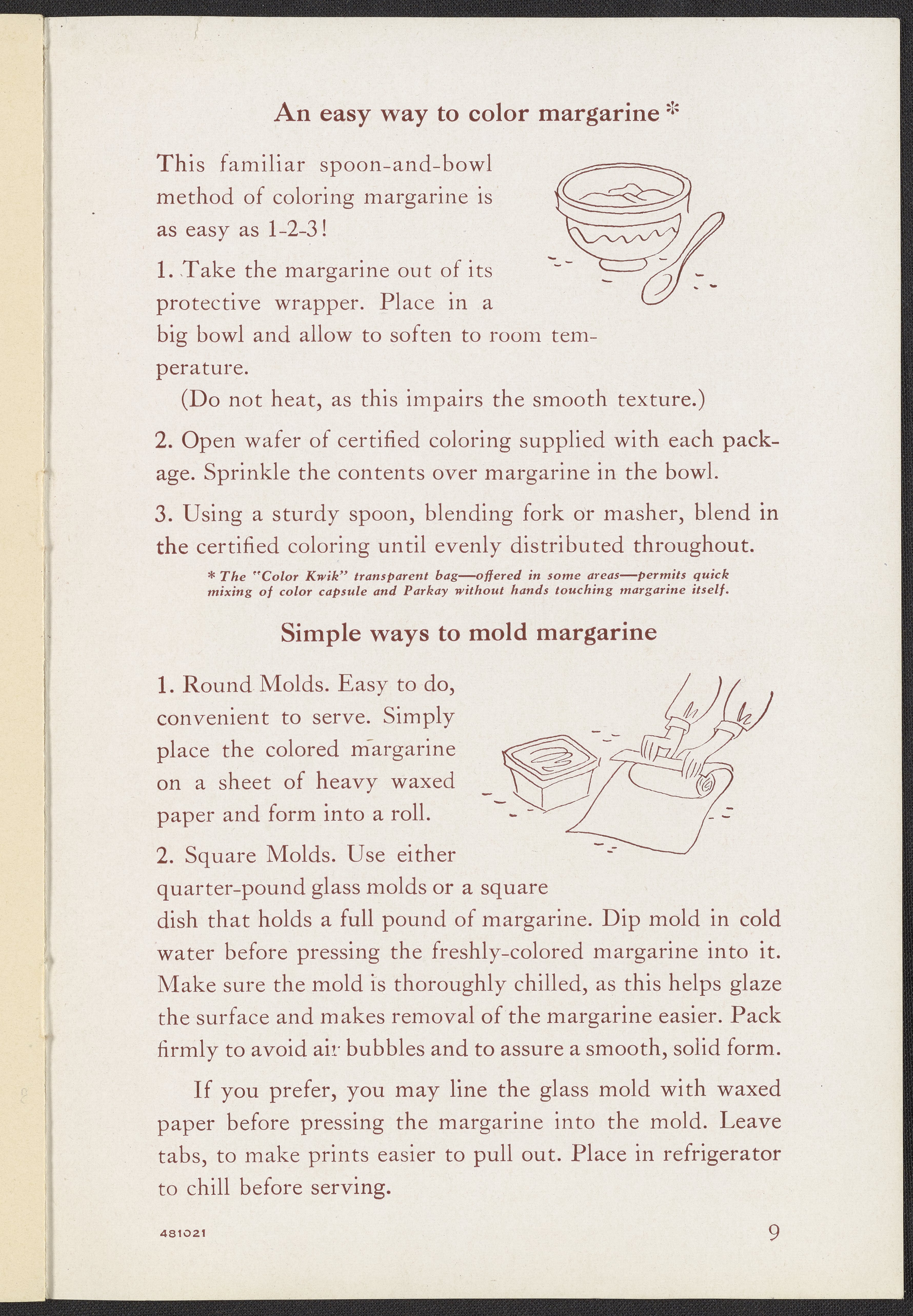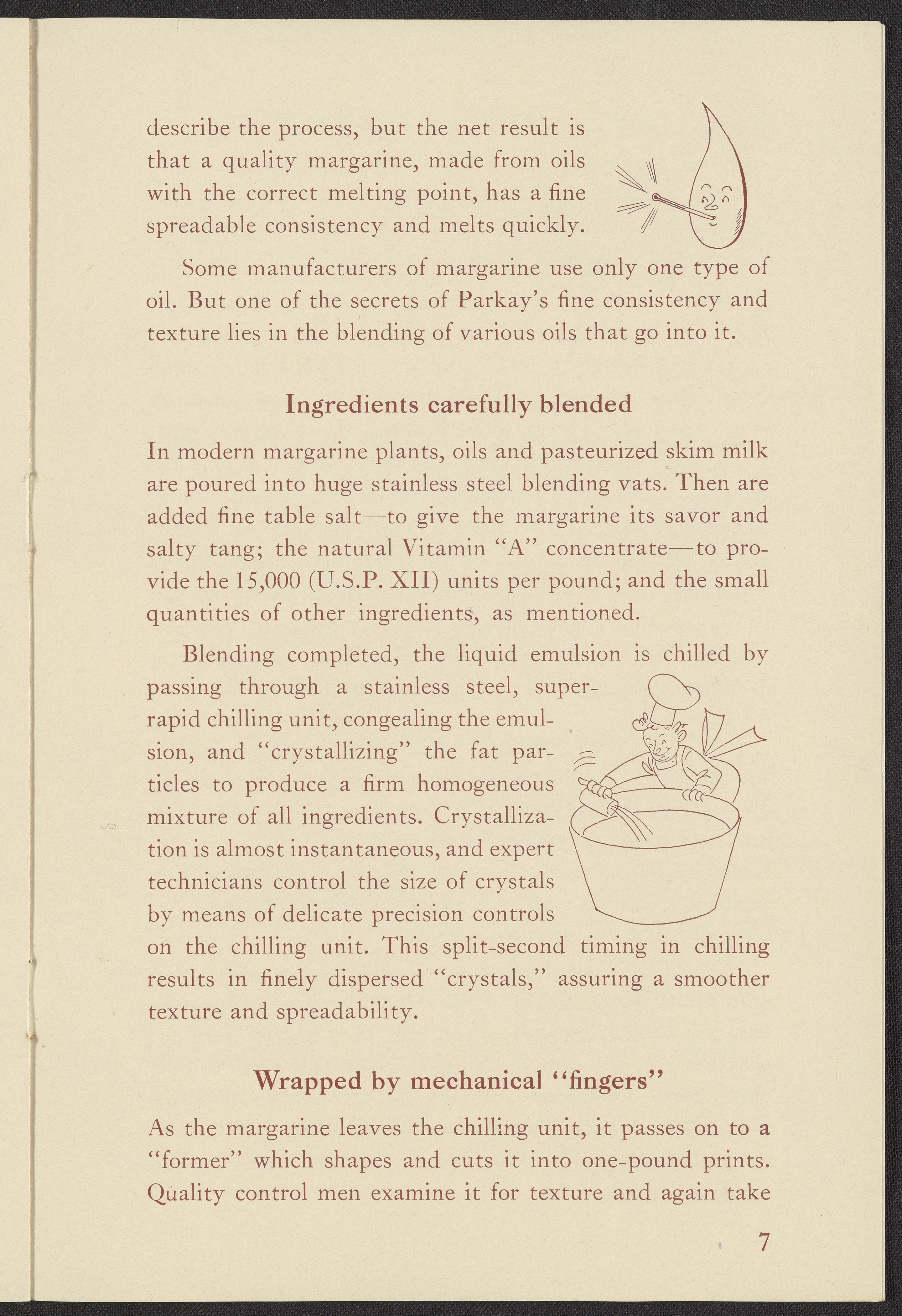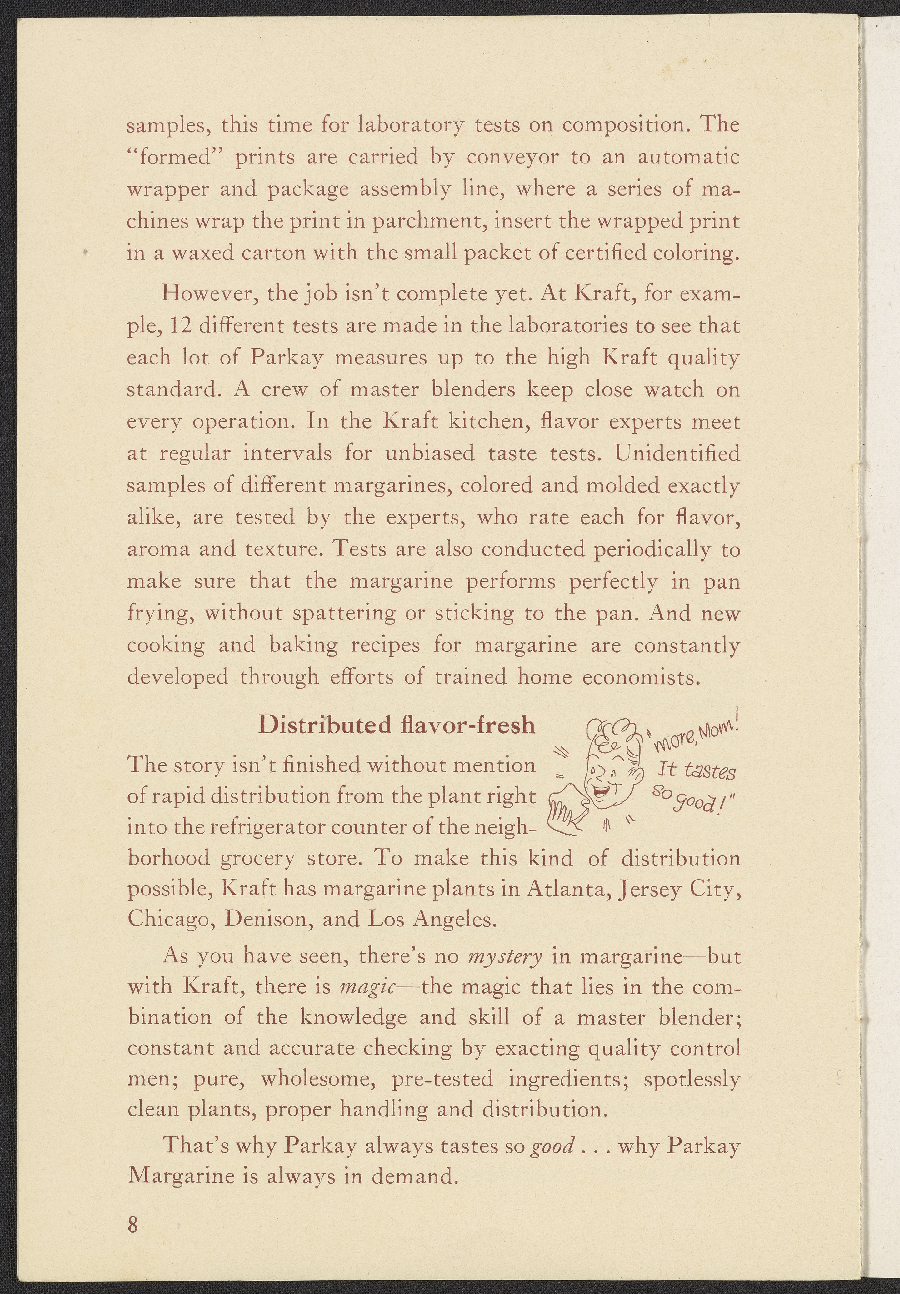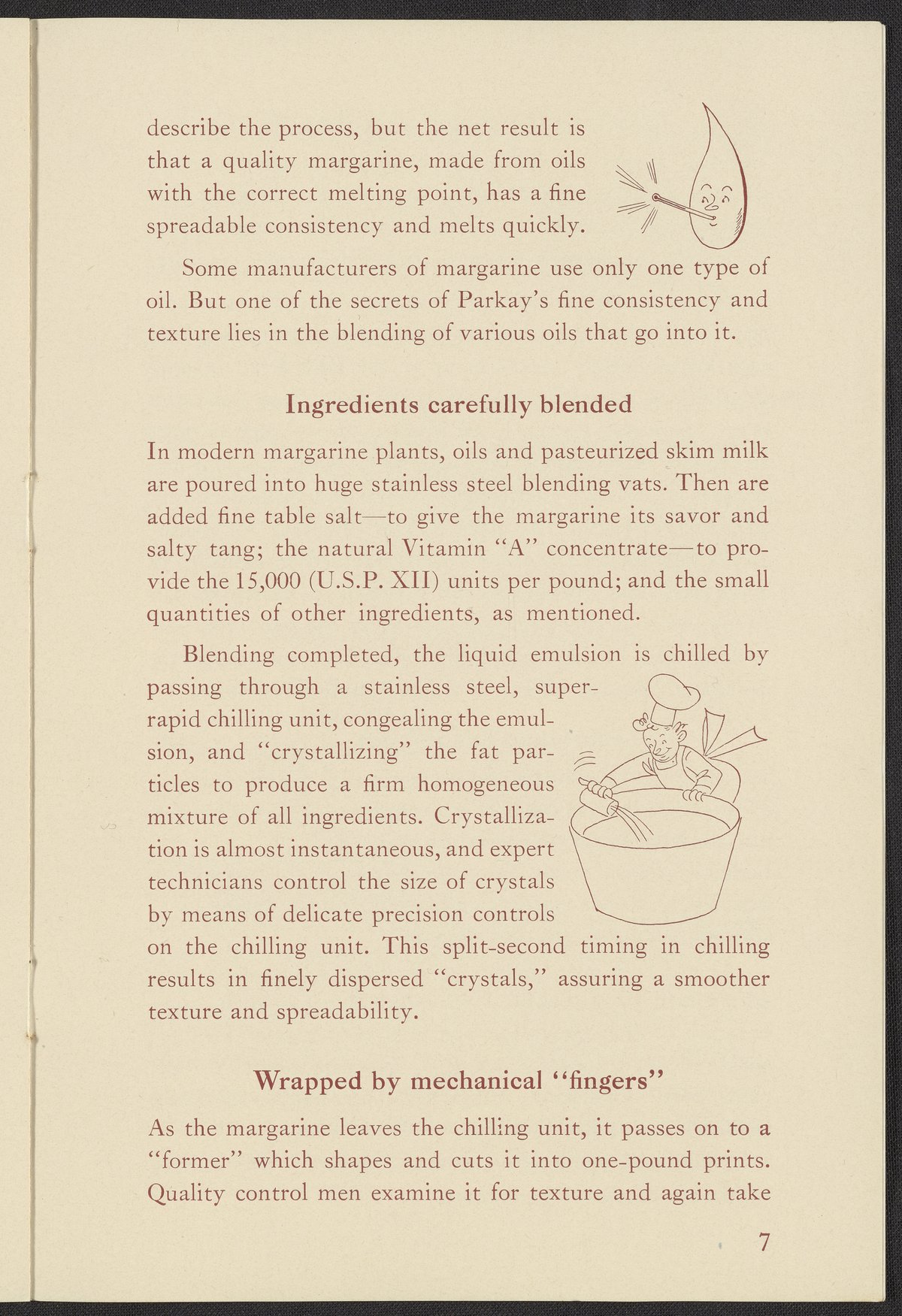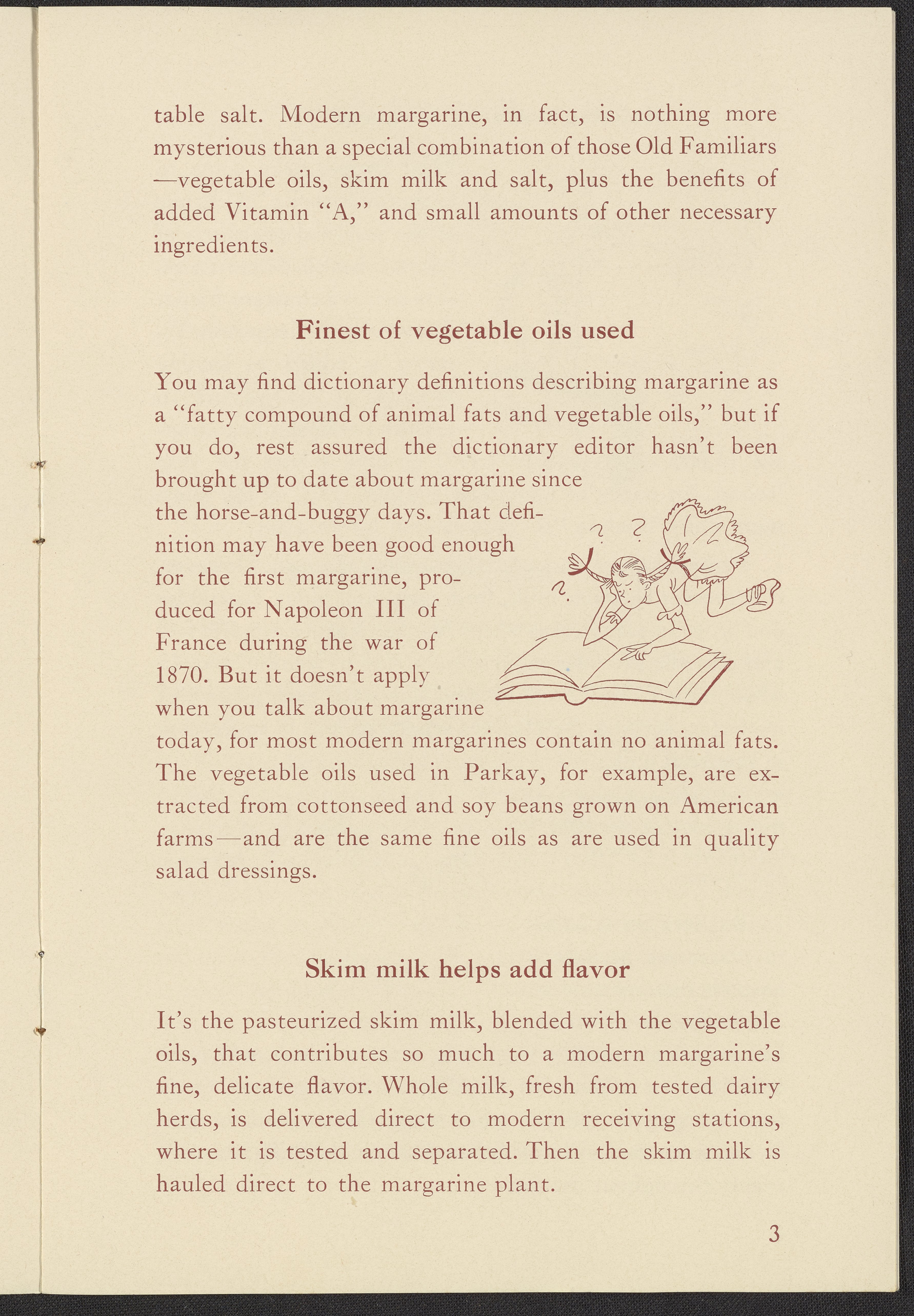 Small JPG1200 x 1771px — 448 KBLarge JPG2880 x 4251px — 2.1 MBFull-sized JPG3500 x 5166px — 2.9 MBOriginal fileTIFF — 3500 x 5166px — 51.8 MBInformational pamphlet about margarine published and distributed by the Kraft Foods Company Customer Service Department. The pamphlet details the ingredients and process for making Kraft Parkay, with an emphasis on demystifying the product for consumers concerned about the quality and nutritive value of margarine.