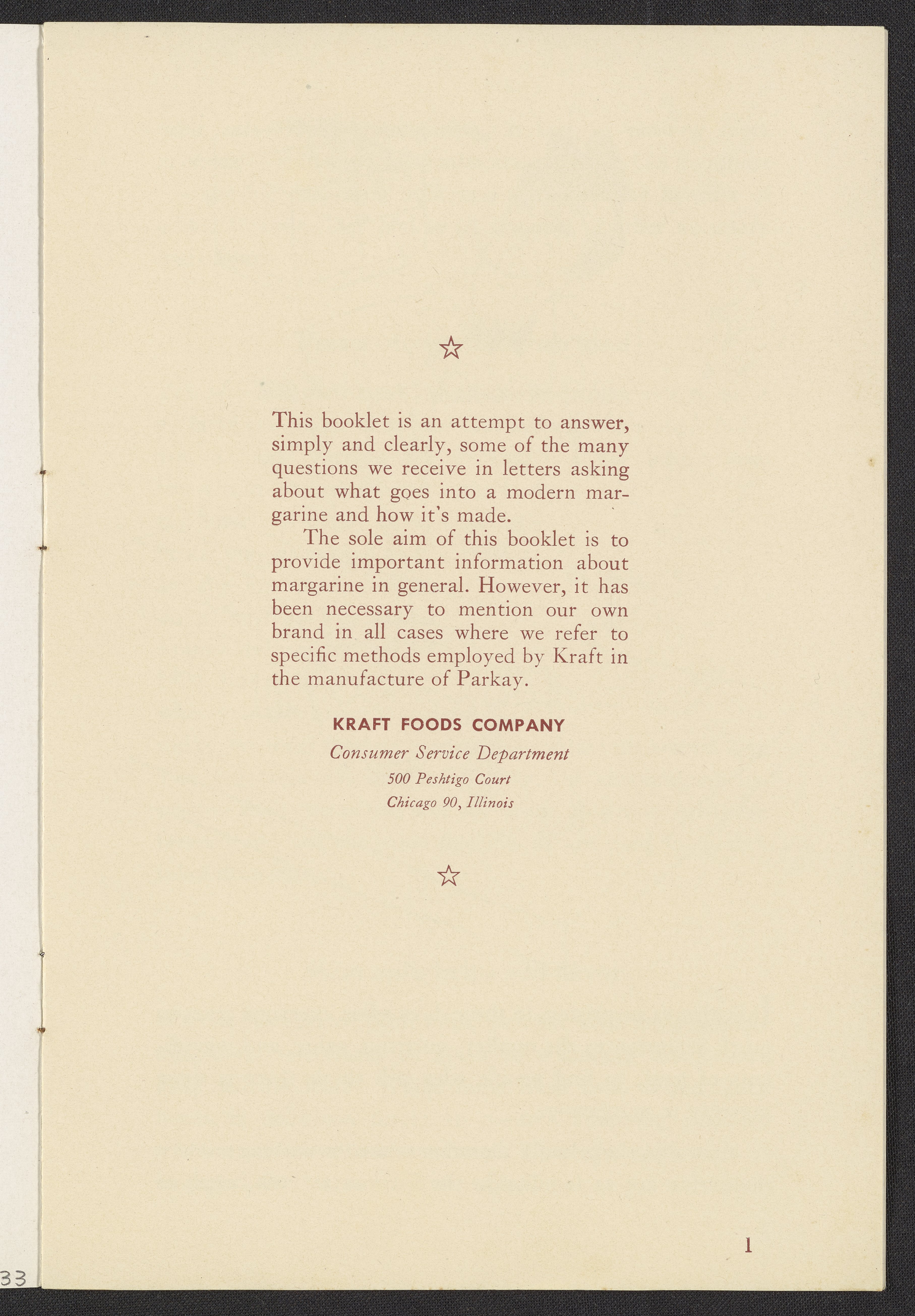 Small JPG1200 x 1771px — 448 KBLarge JPG2880 x 4251px — 2.1 MBFull-sized JPG3500 x 5166px — 2.9 MBOriginal fileTIFF — 3500 x 5166px — 51.8 MBInformational pamphlet about margarine published and distributed by the Kraft Foods Company Customer Service Department. The pamphlet details the ingredients and process for making Kraft Parkay, with an emphasis on demystifying the product for consumers concerned about the quality and nutritive value of margarine.