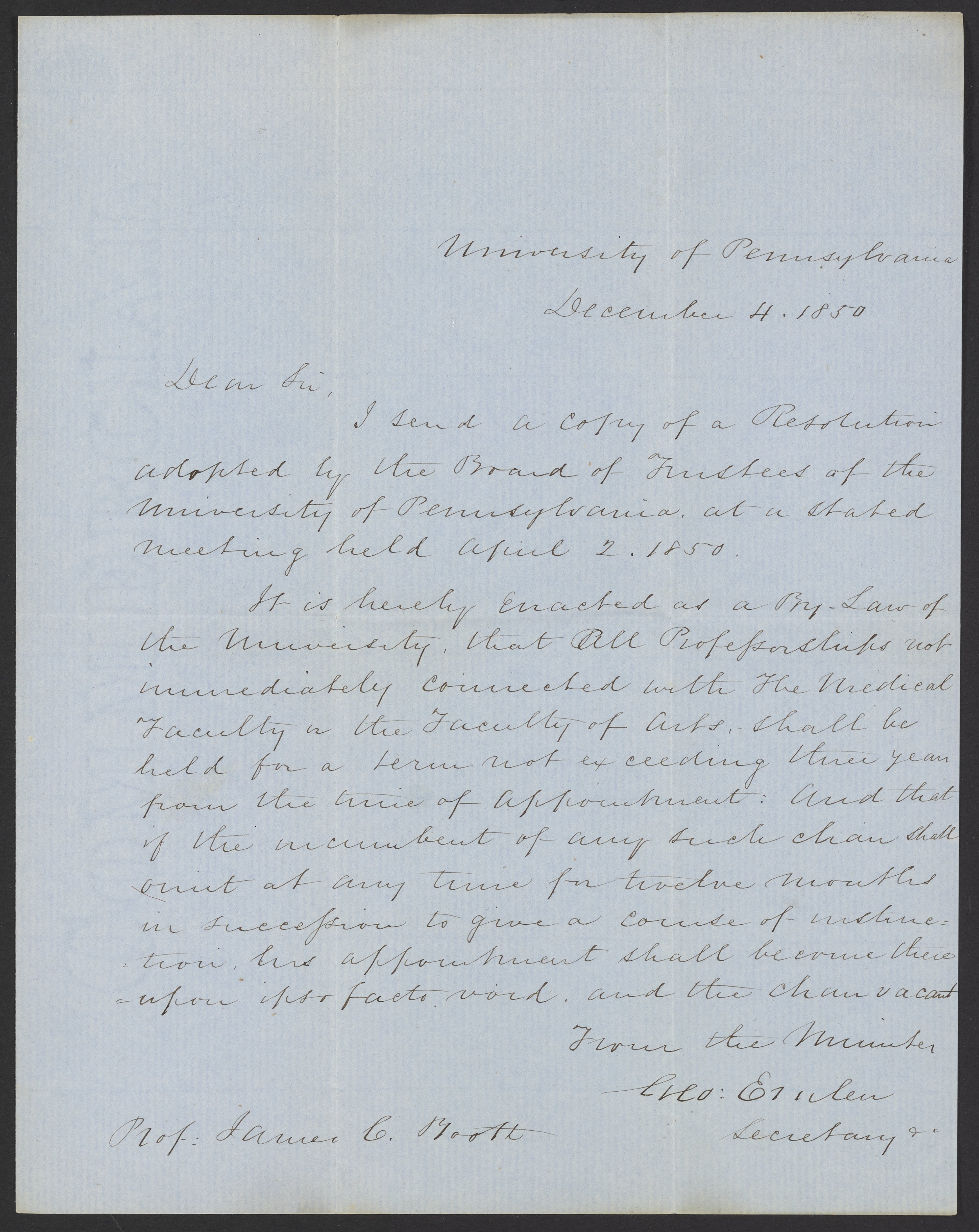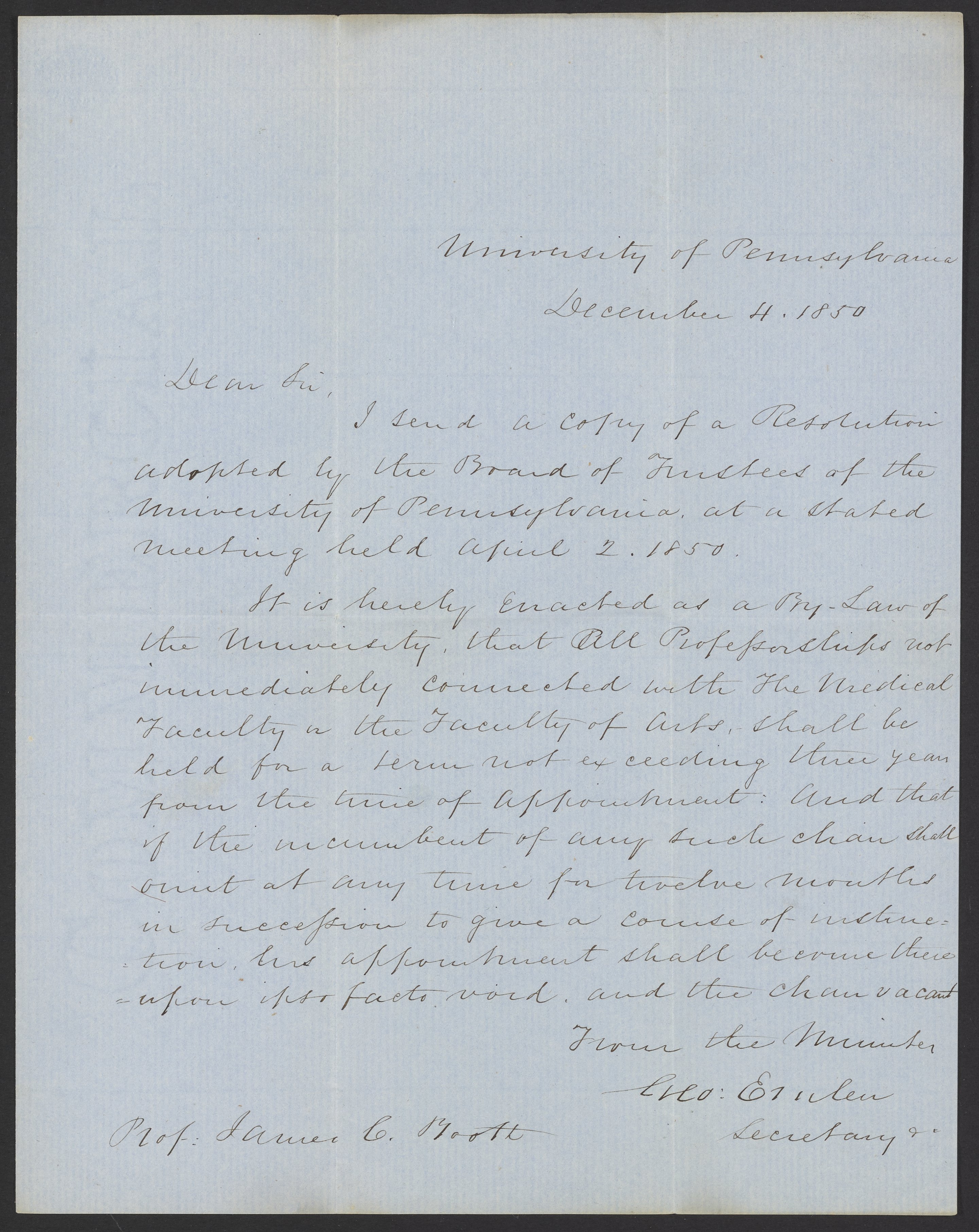 Emlen, G. “Letter from G. Emlen, Secretary of the University of Pennsylvania to James Curtis Booth,” December 4, 1850. Papers of James Curtis Booth, Box 1, Folder 6. Science History Institute. Philadelphia. https://digital.sciencehistory.org/works/1h48jlq.