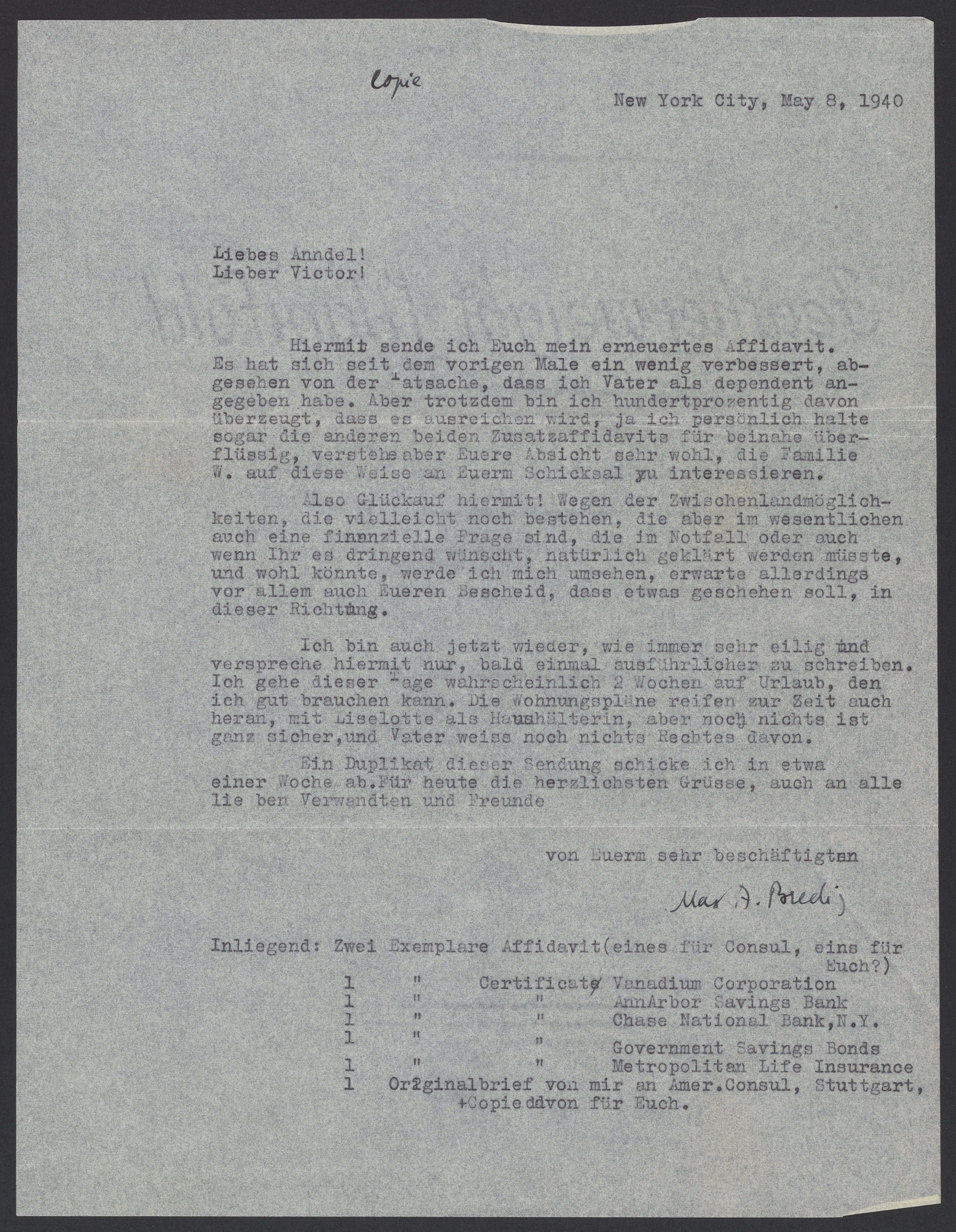 Letter from Max Bredig to Marianne and Viktor Homburger, May 8, 1940
