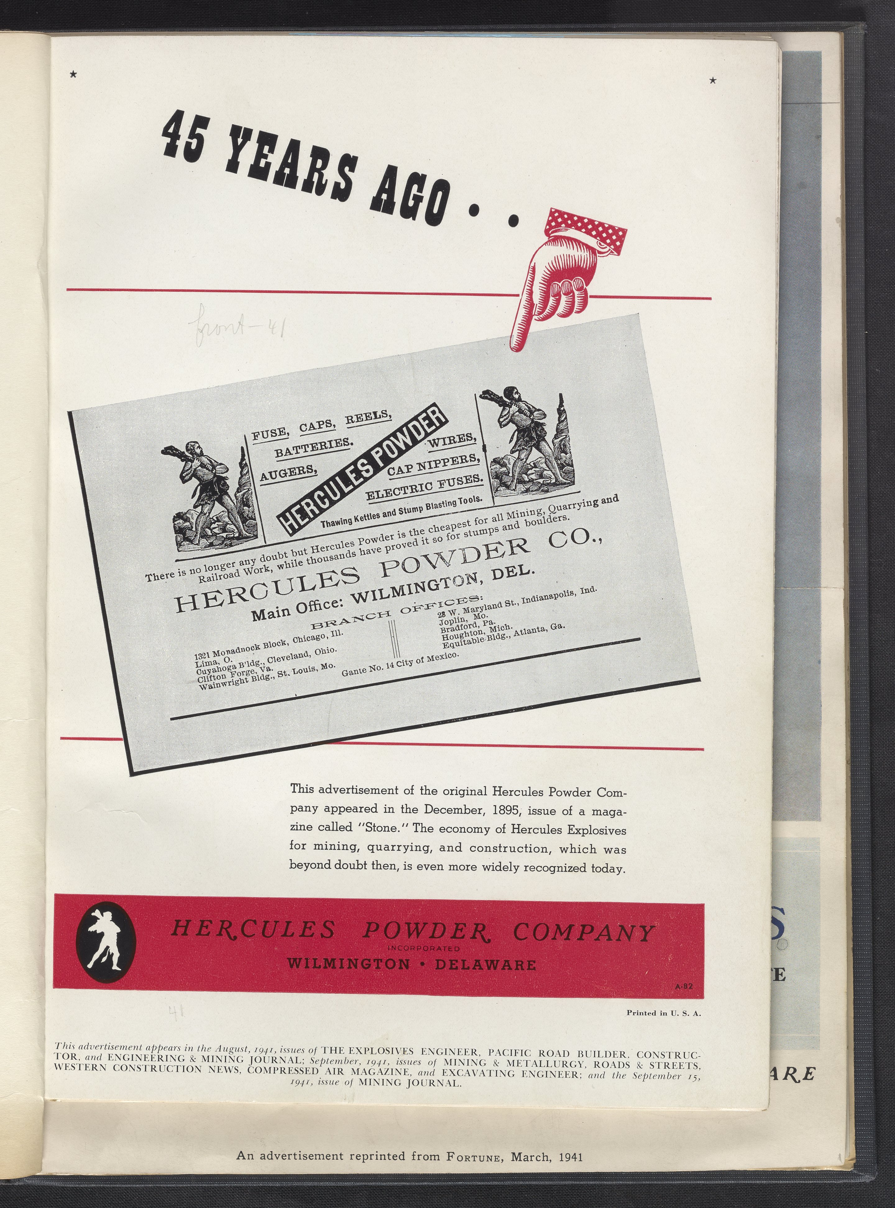 Hercules Incorporated. “45 Years Ago...Hercules Powder Company.” 1941 Hercules Advertisements, 1941. Records of Hercules Incorporated, Volume 1941. Science History Institute. Philadelphia. https://digital.sciencehistory.org/works/1j92g8258.